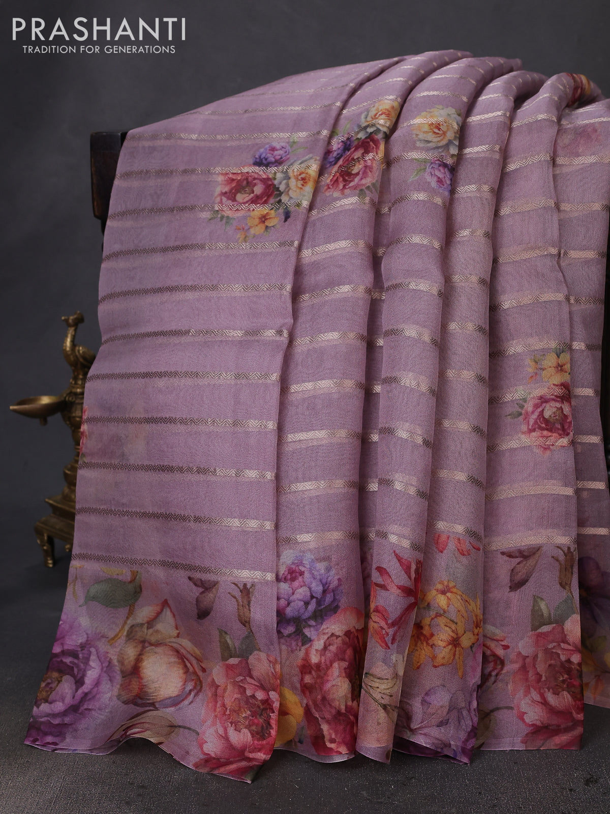 Pure organza silk saree pastel purple with allover zari strip & floral digital prints and floral digital printed border