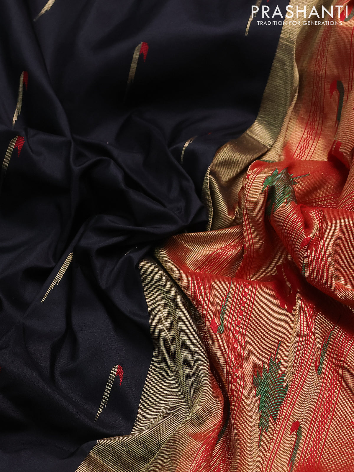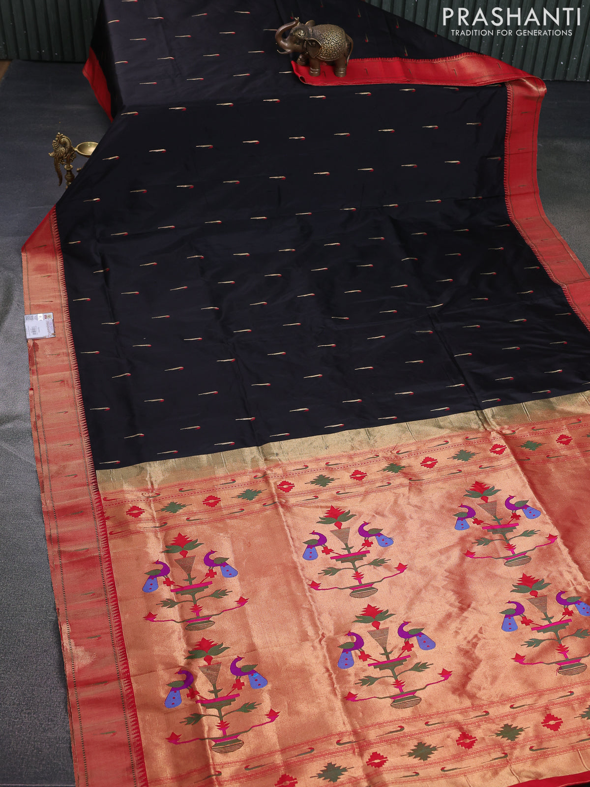 Pure paithani silk saree black and red with allover thread & zari woven muniya buttas and paithani weaving pallu