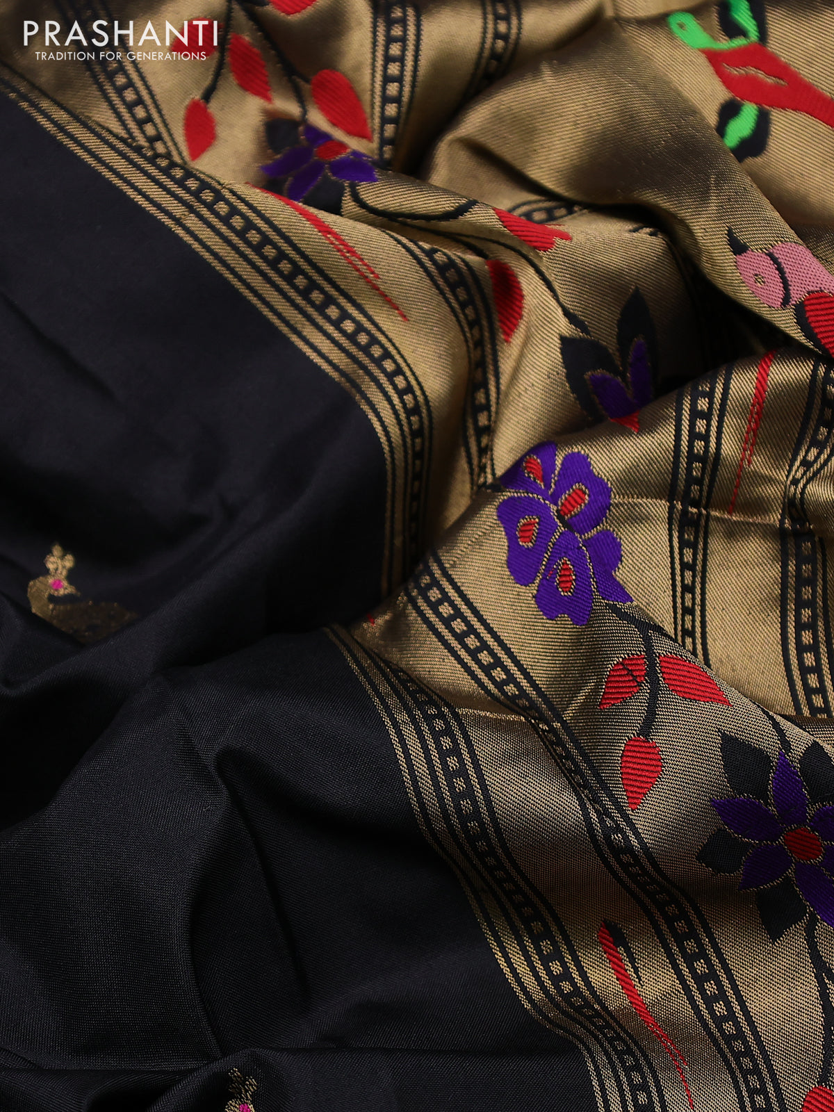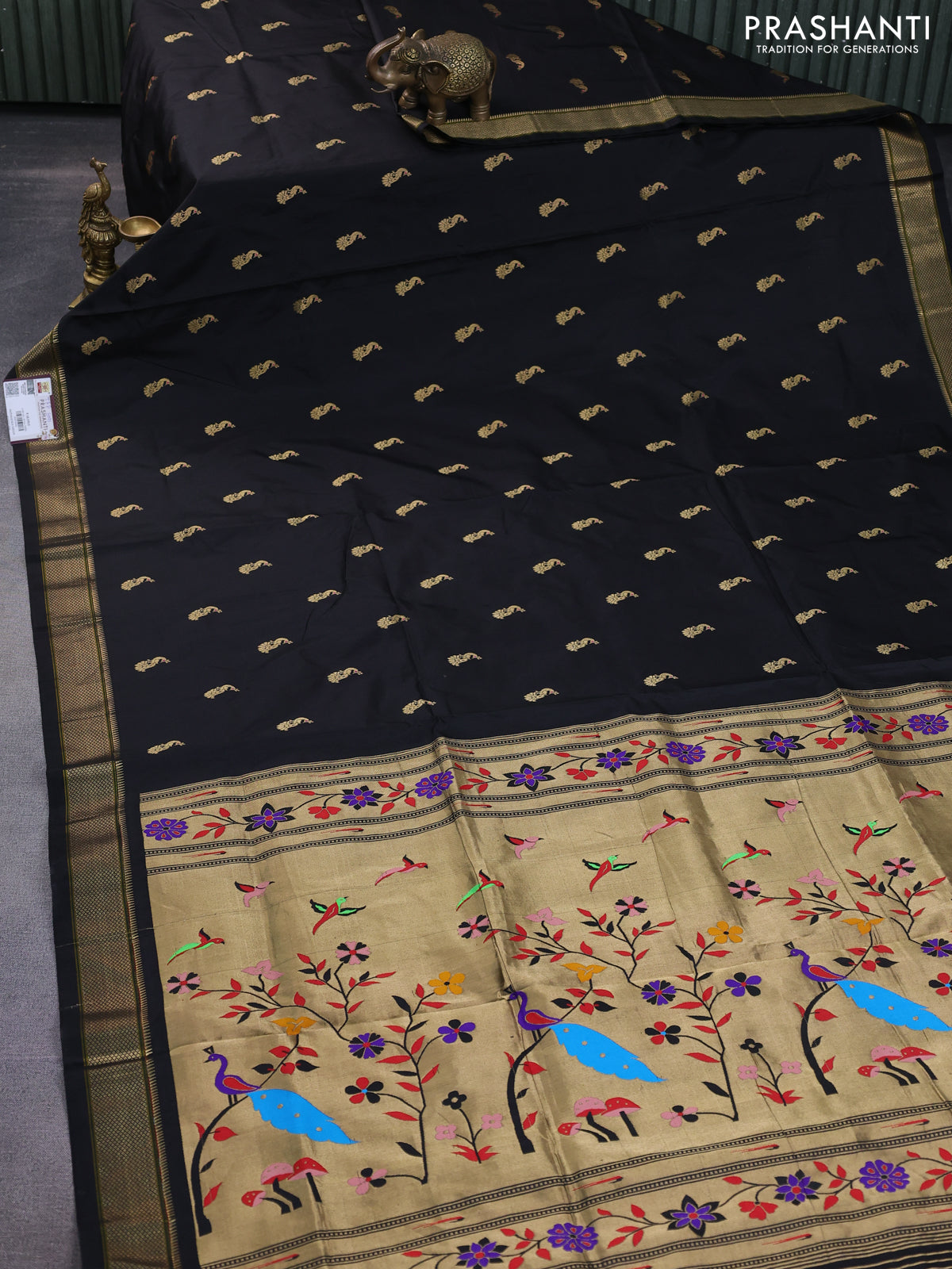 Pure paithani silk saree black with zari woven peacock buttas and paithani design pallu