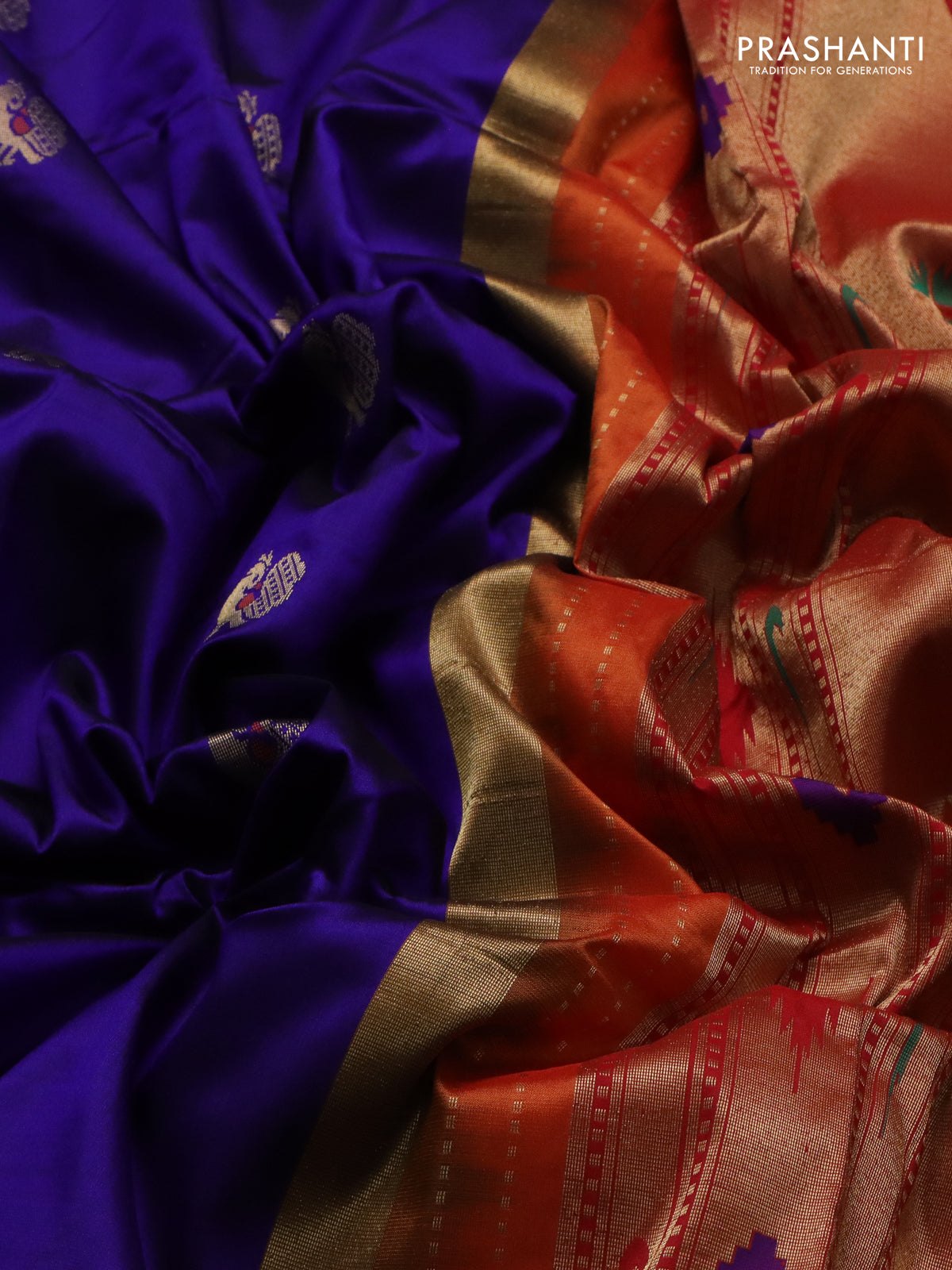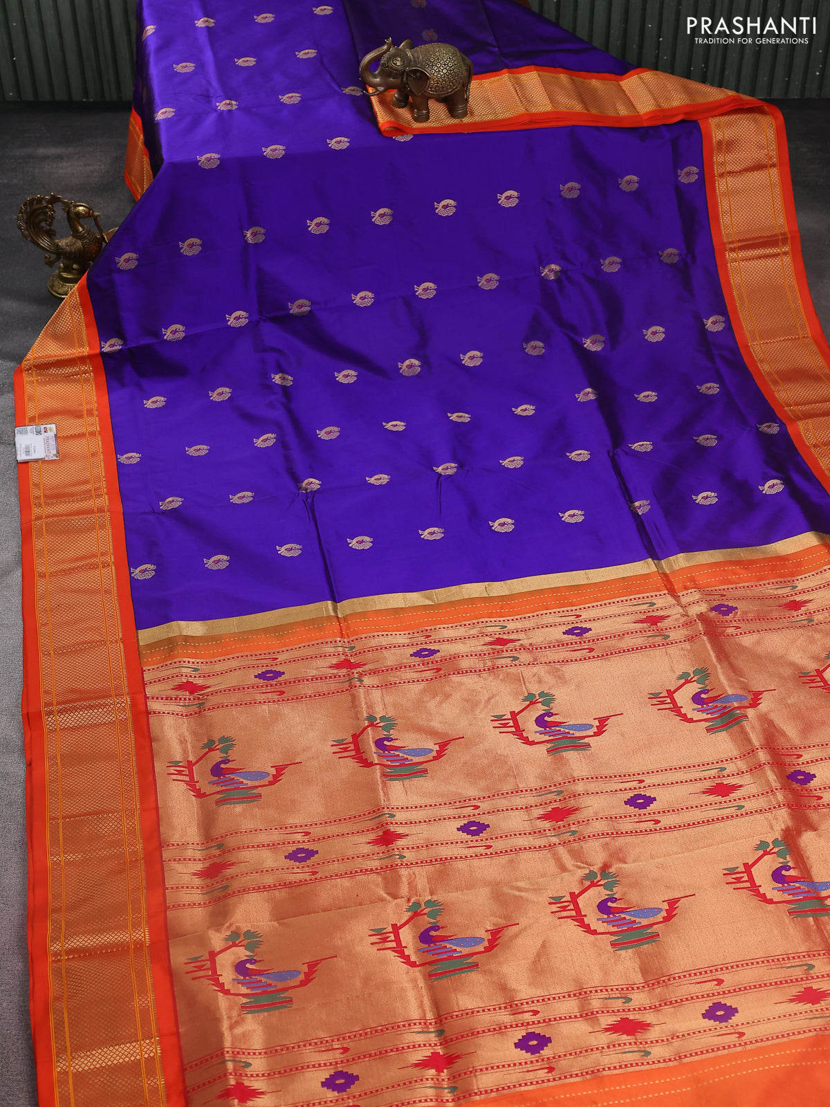 Pure paithani silk saree blue and orange with annam zari woven buttas and zari woven korvai border