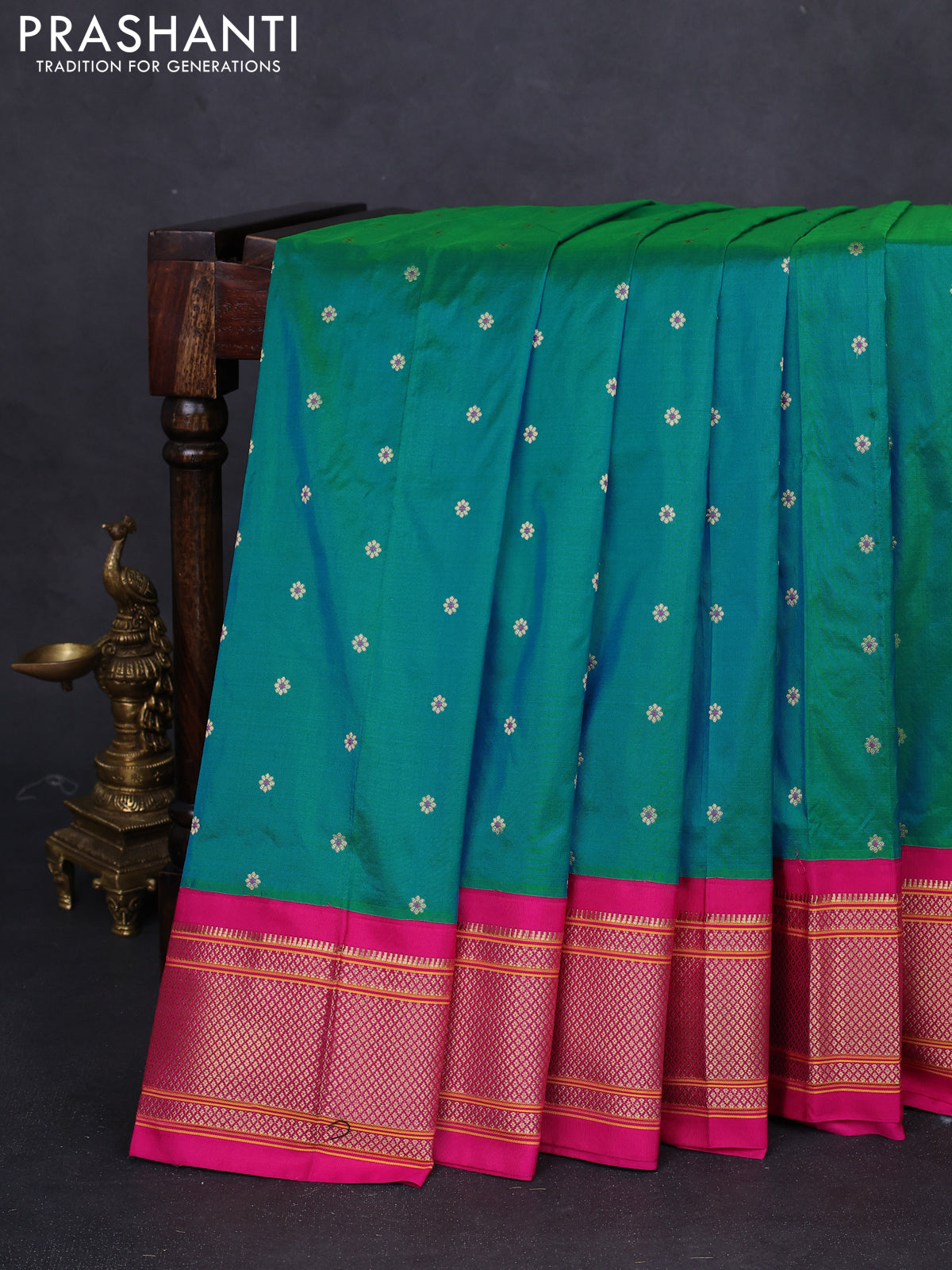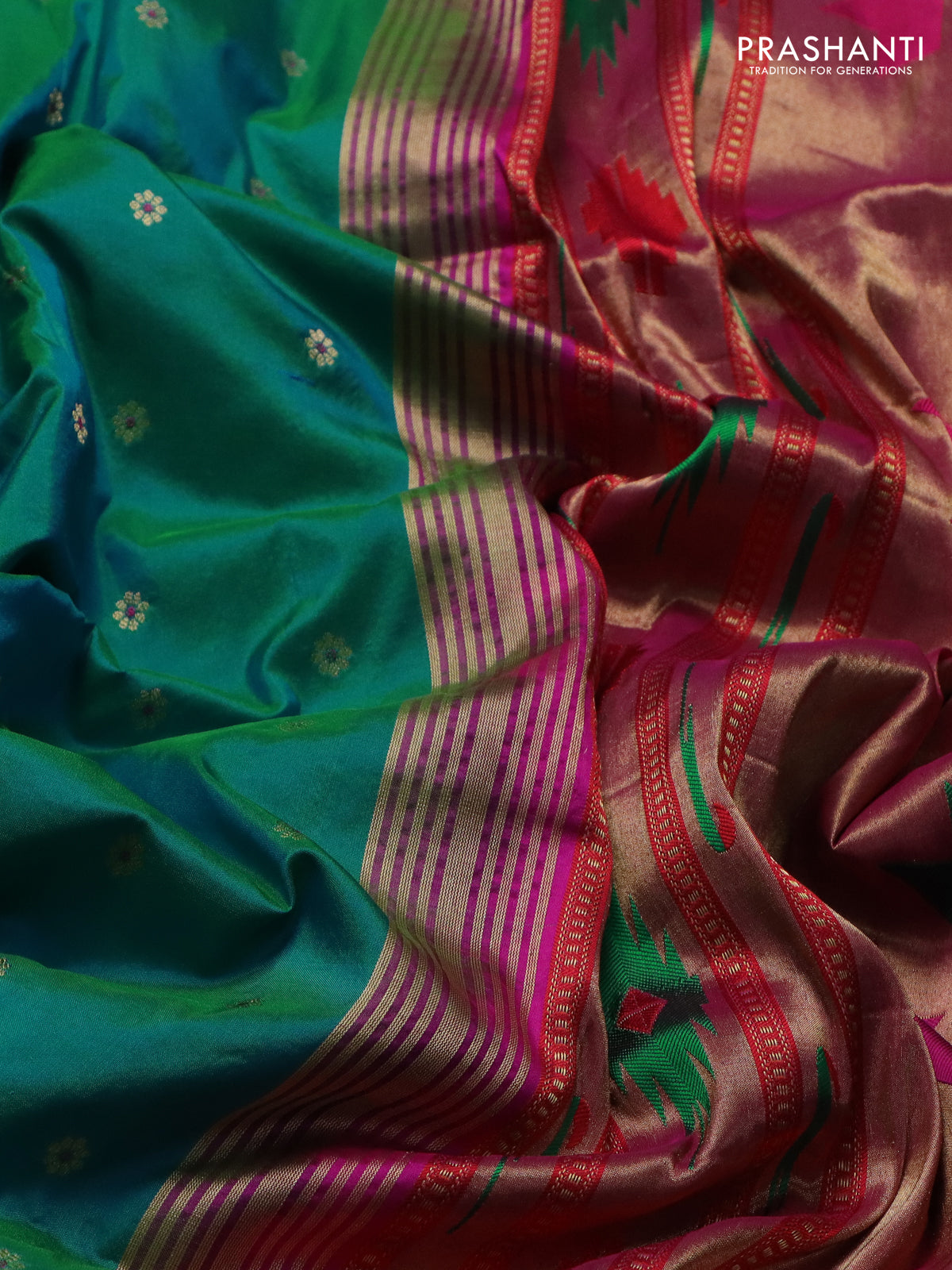 Pure paithani silk saree dual shade of teal bluish green and pink with allover floral zari woven buttas and paithani design weaving pallu