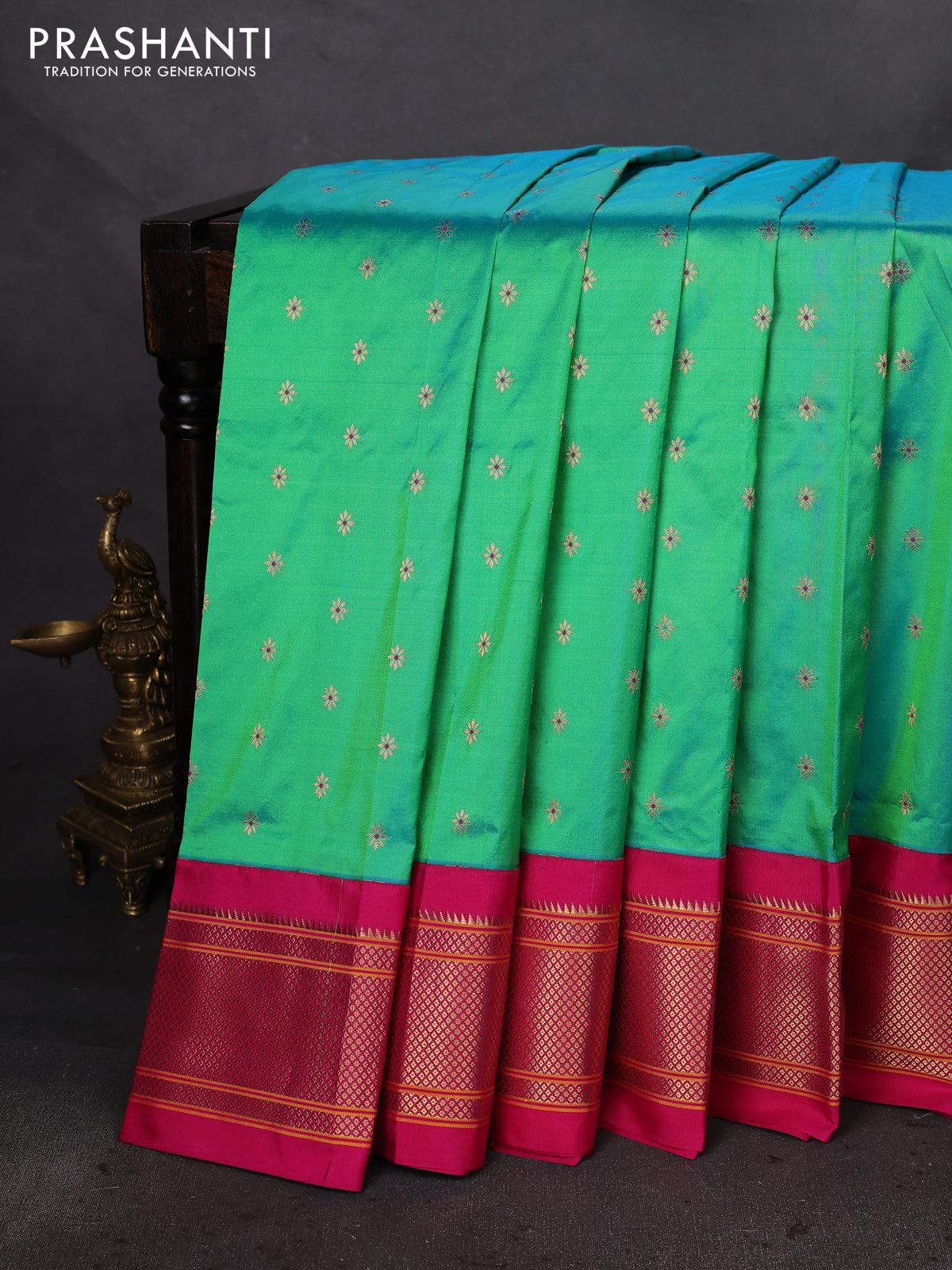 Pure paithani silk saree dual shade of teal bluish green and pink with allover zari woven buttas and paithani weaving pallu