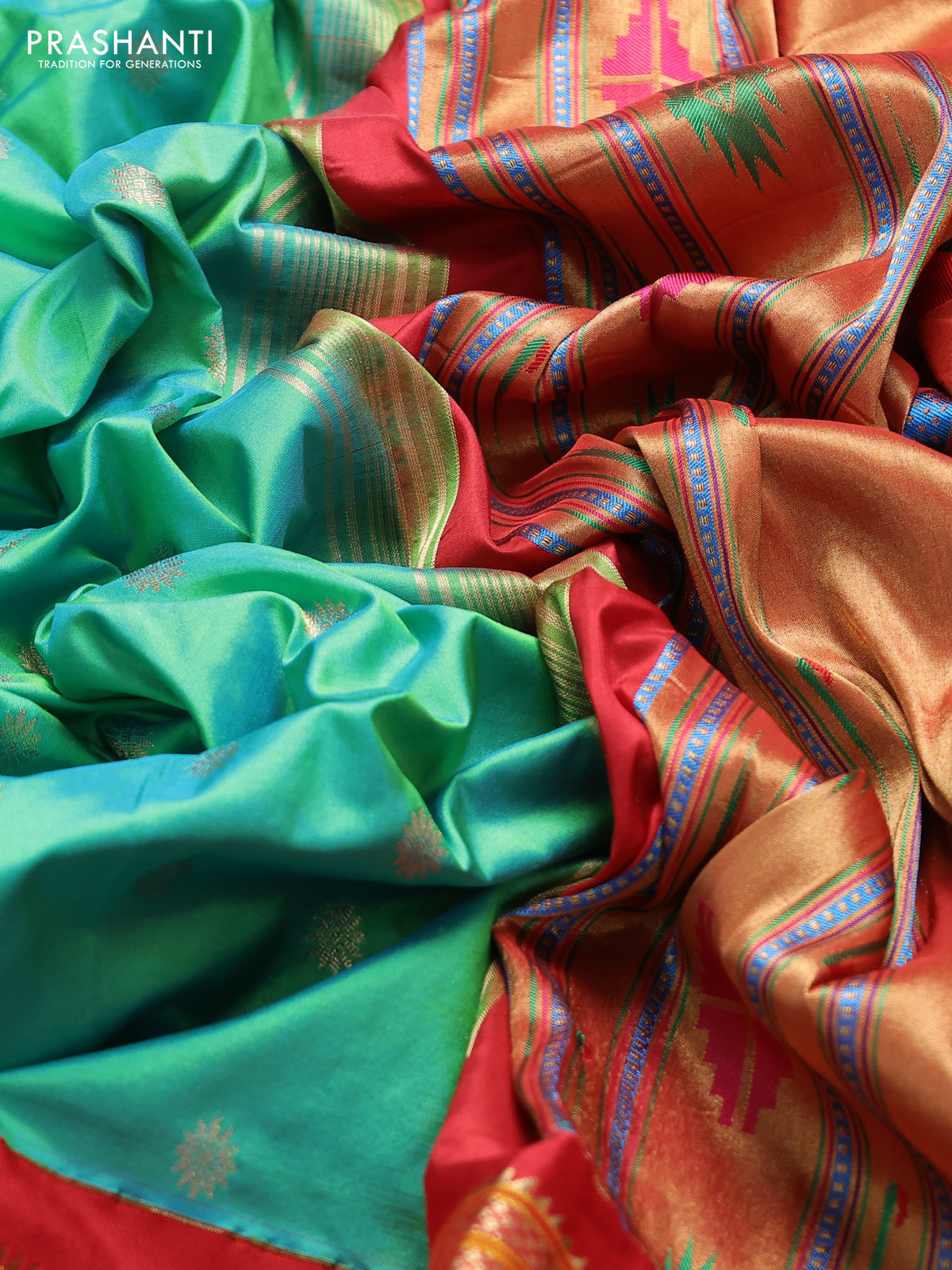 Pure paithani silk saree dual shade of teal bluish green and red with allover zari woven buttas and paithani weaving pallu