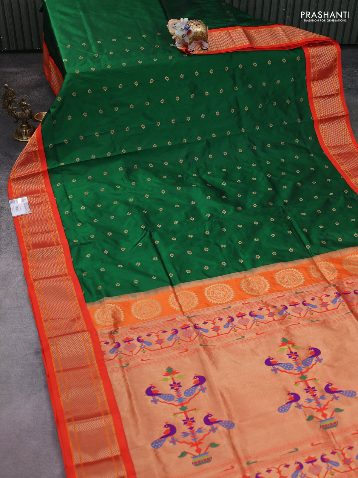 Pure paithani silk saree green and orange with allover zari woven buttas and paithani weaving pallu