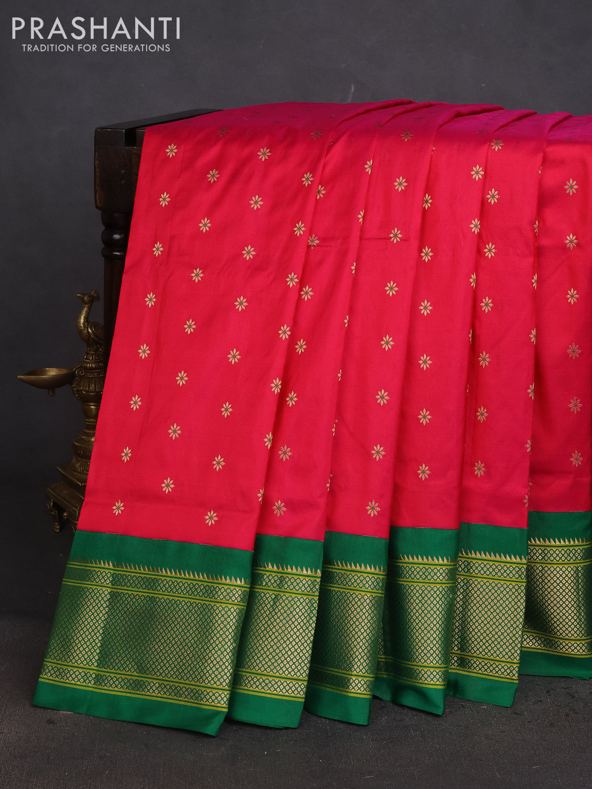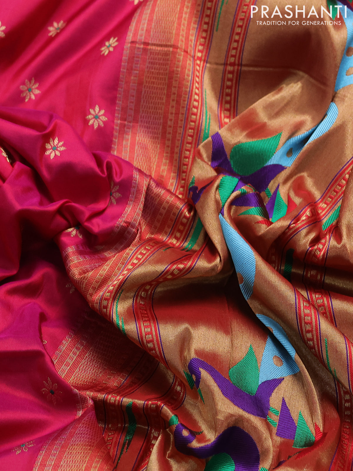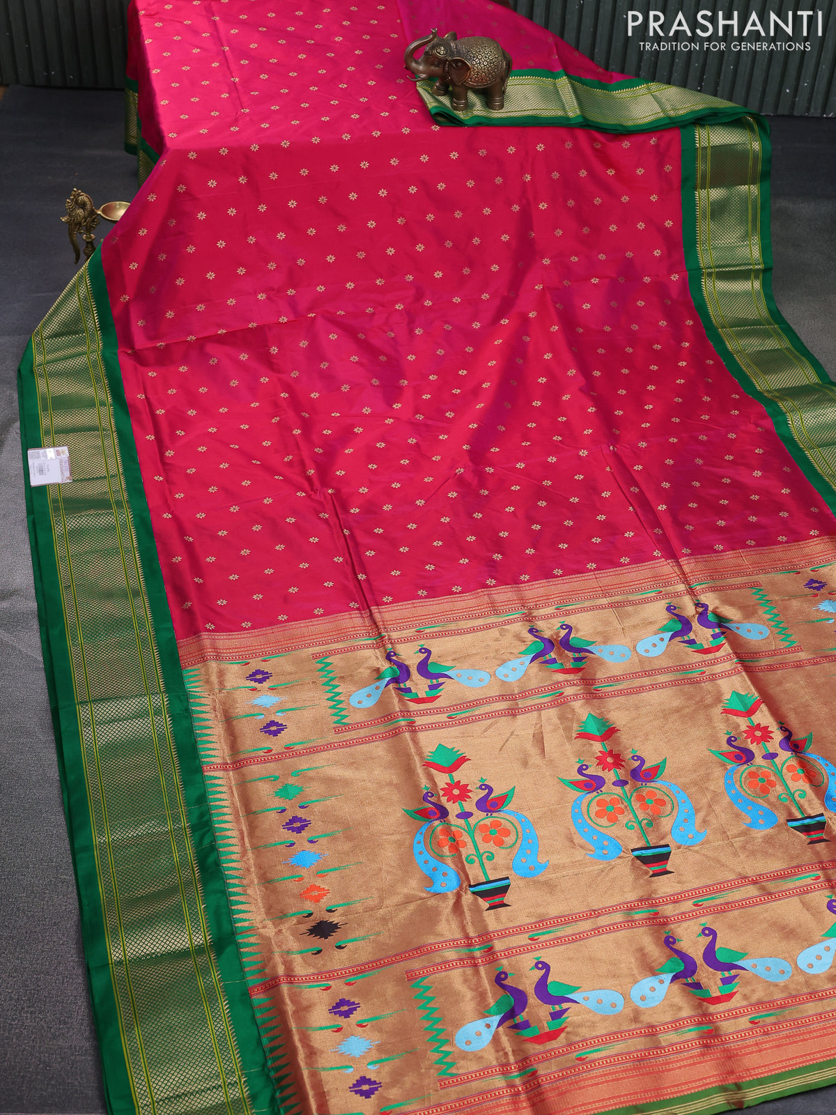 Pure paithani silk saree pink and green with allover thread & zari woven buttas and paithani weaving pallu