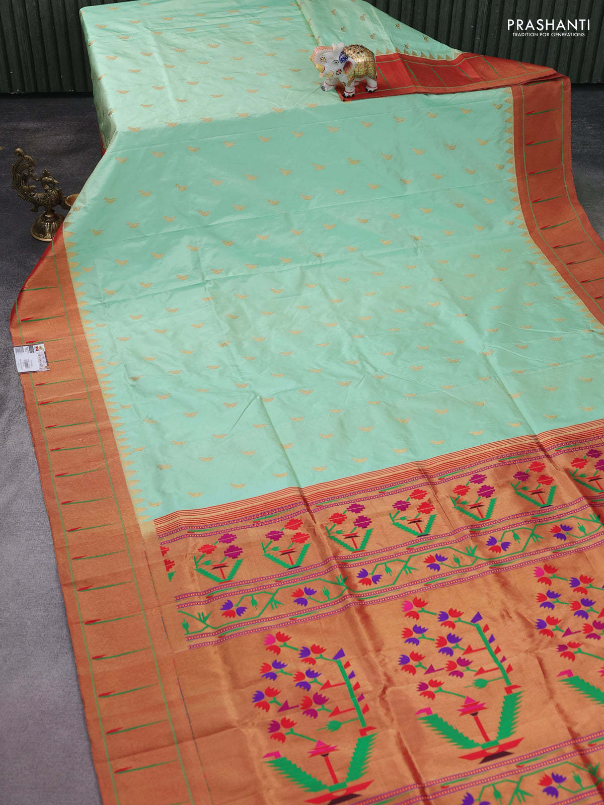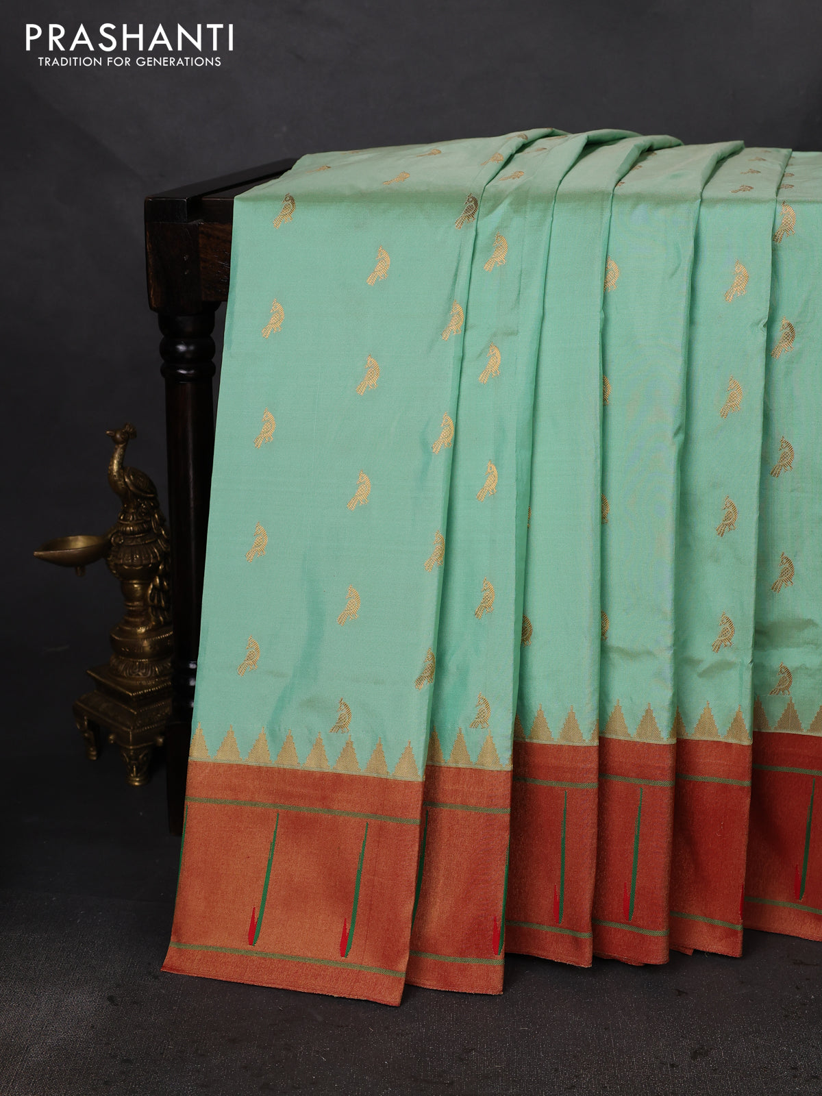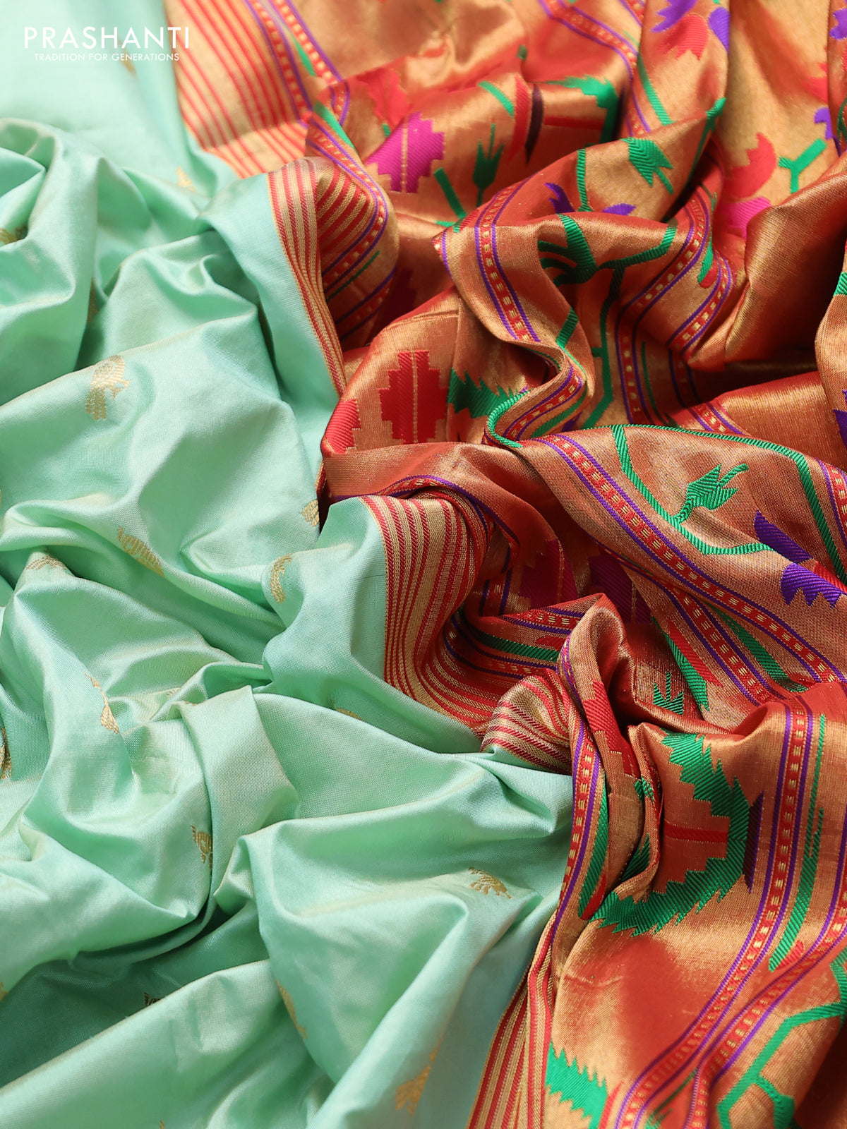 Pure paithani silk saree pista green and red with allover peacock zari woven buttas and zari woven muniya butta border