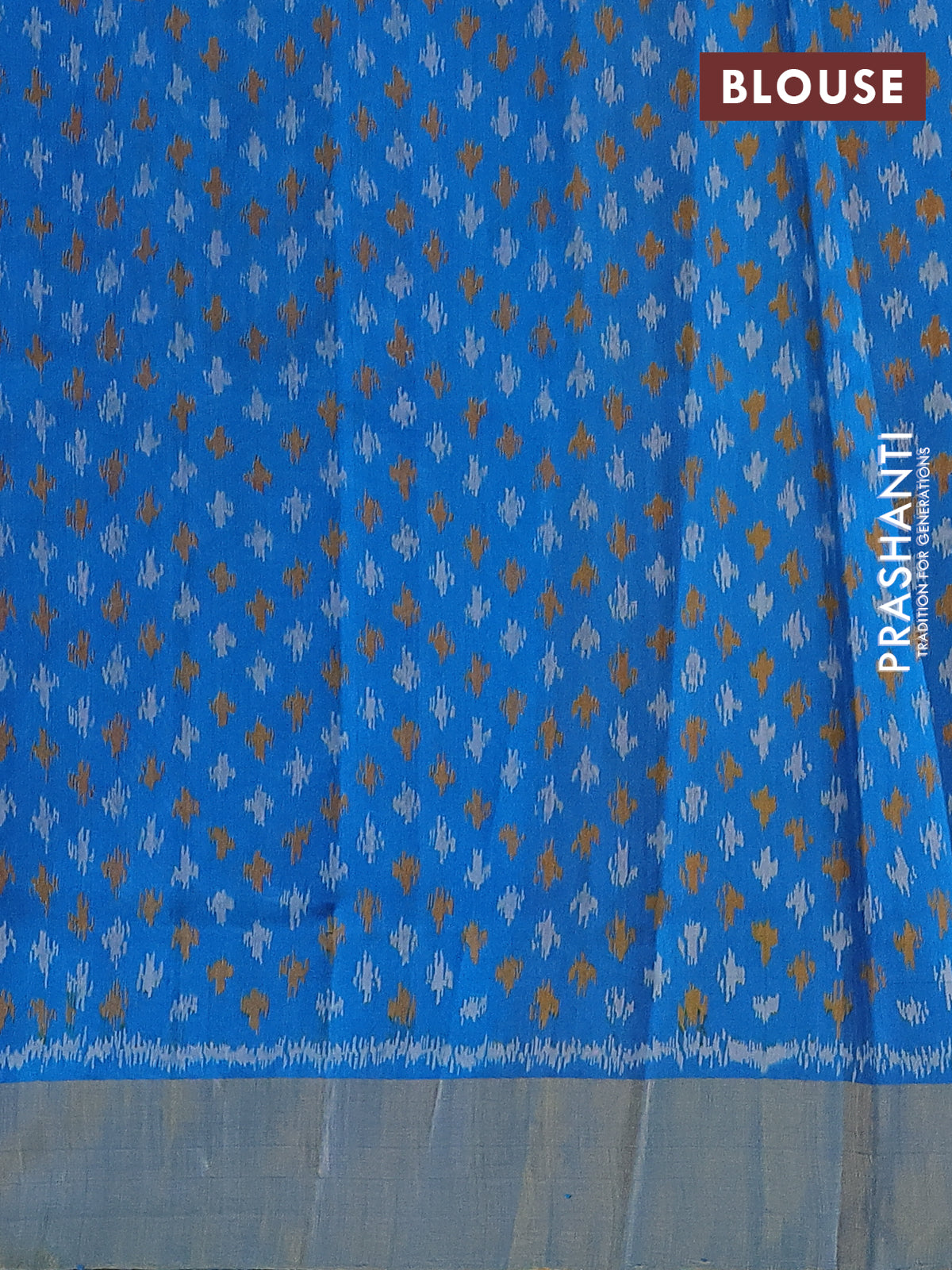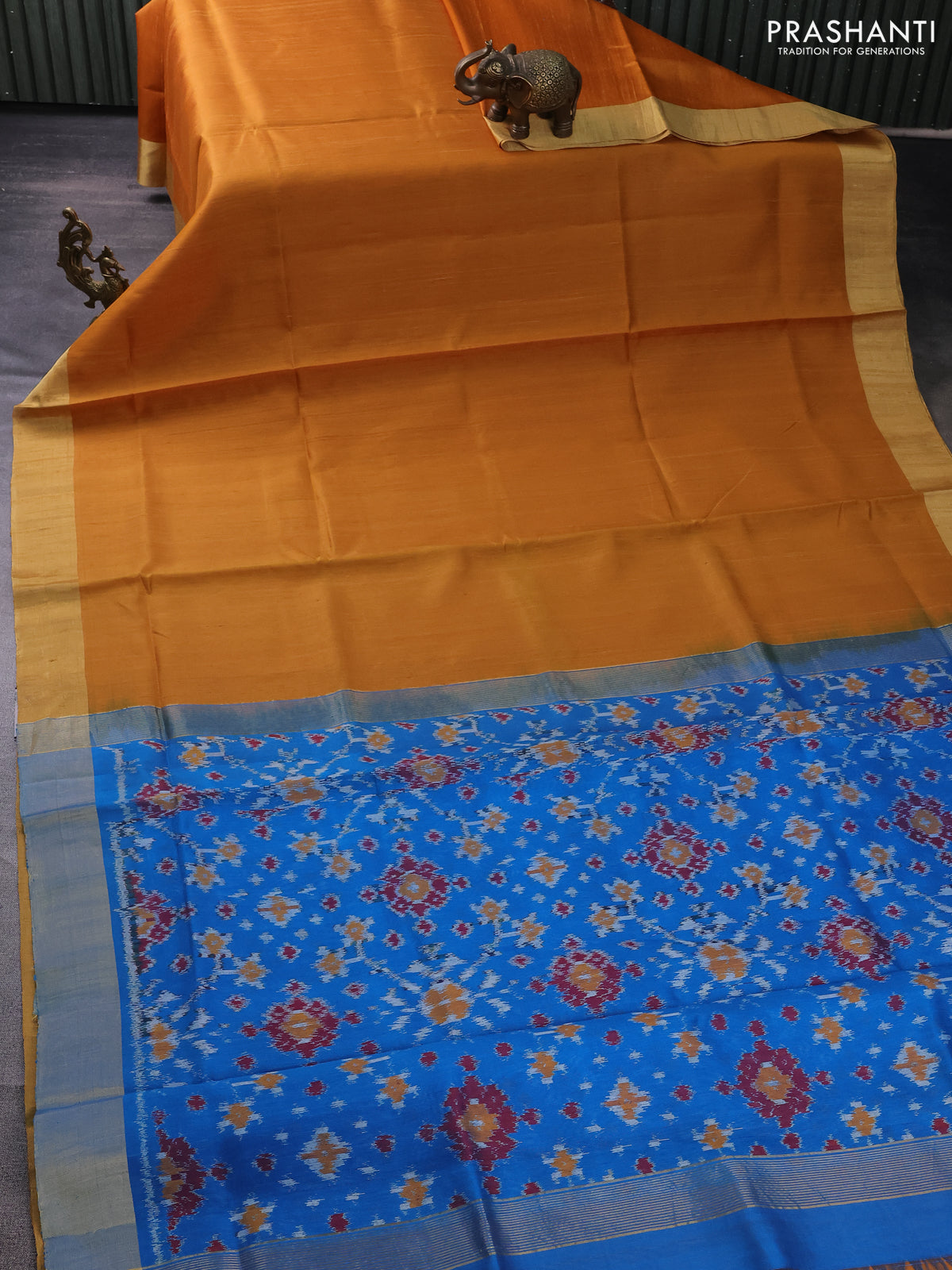 Pure raw silk saree mustard yellow and cs blue with plain body and ikat weaves pallu