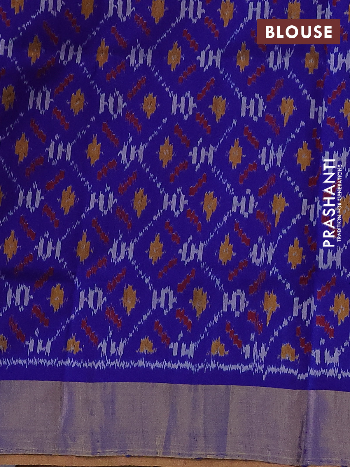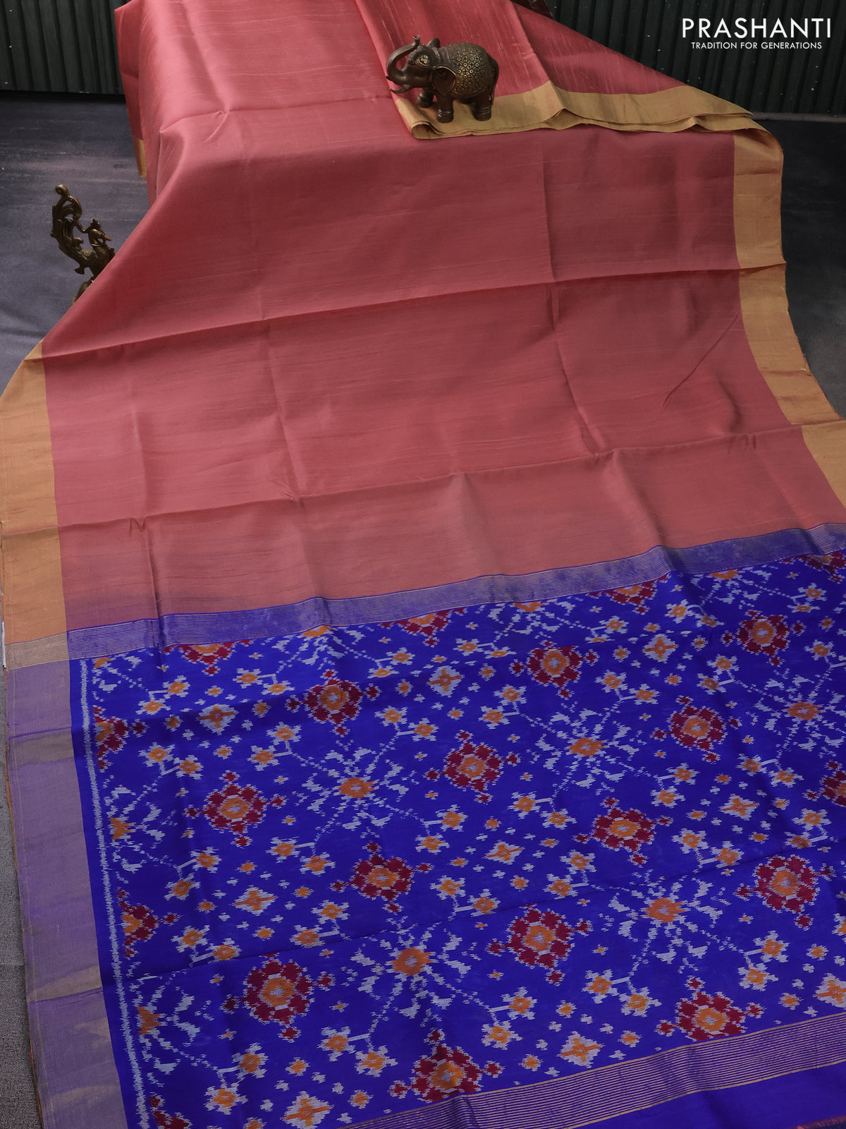 Pure raw silk saree peach shade and royal blue with plain body and ikat weaves pallu