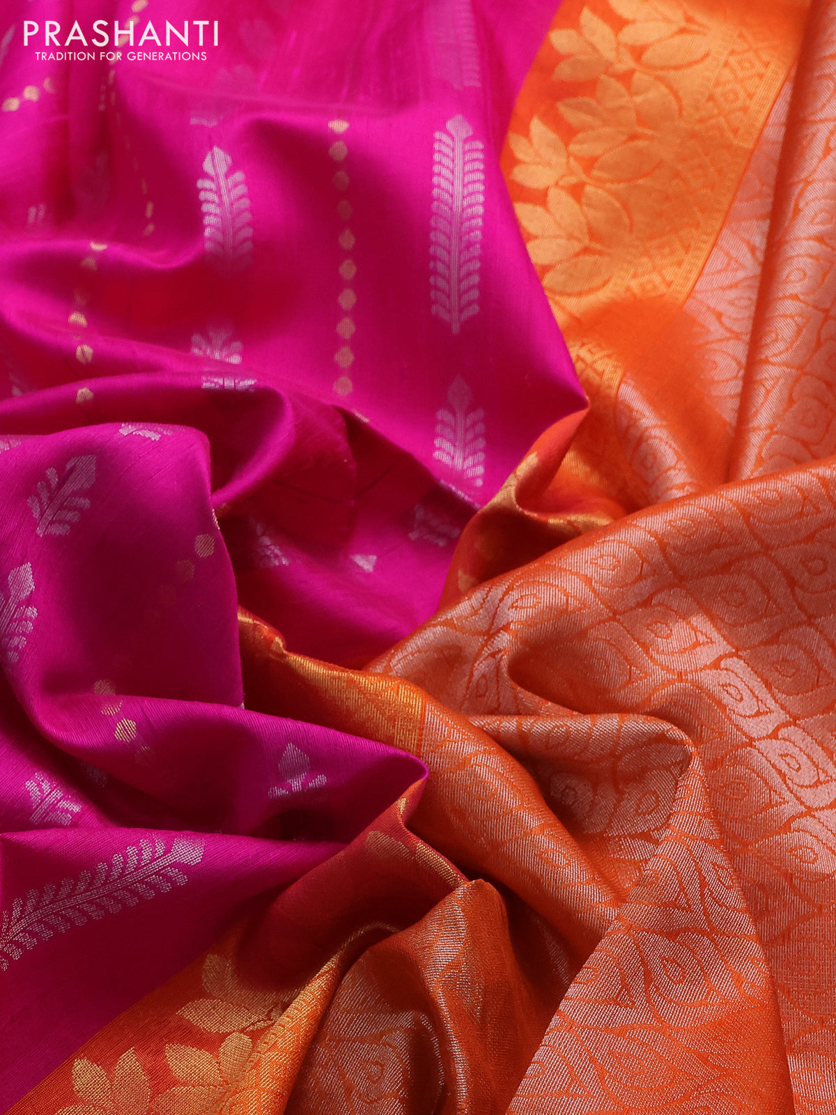 Pure raw silk saree pink and orange with allover silver & gold zari weaves and zari woven border