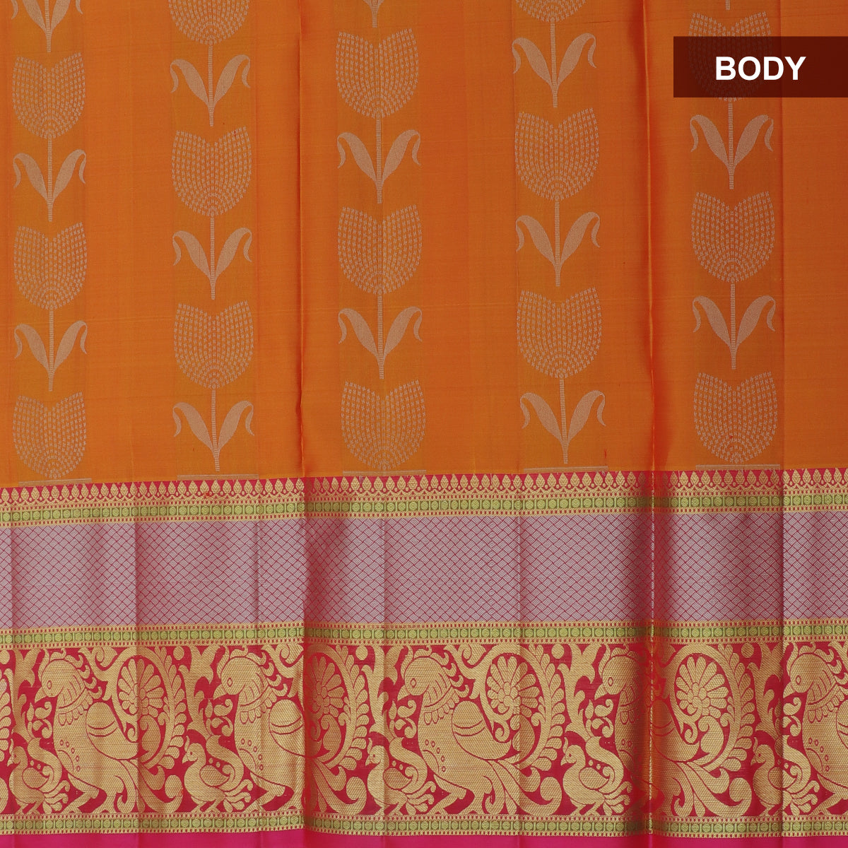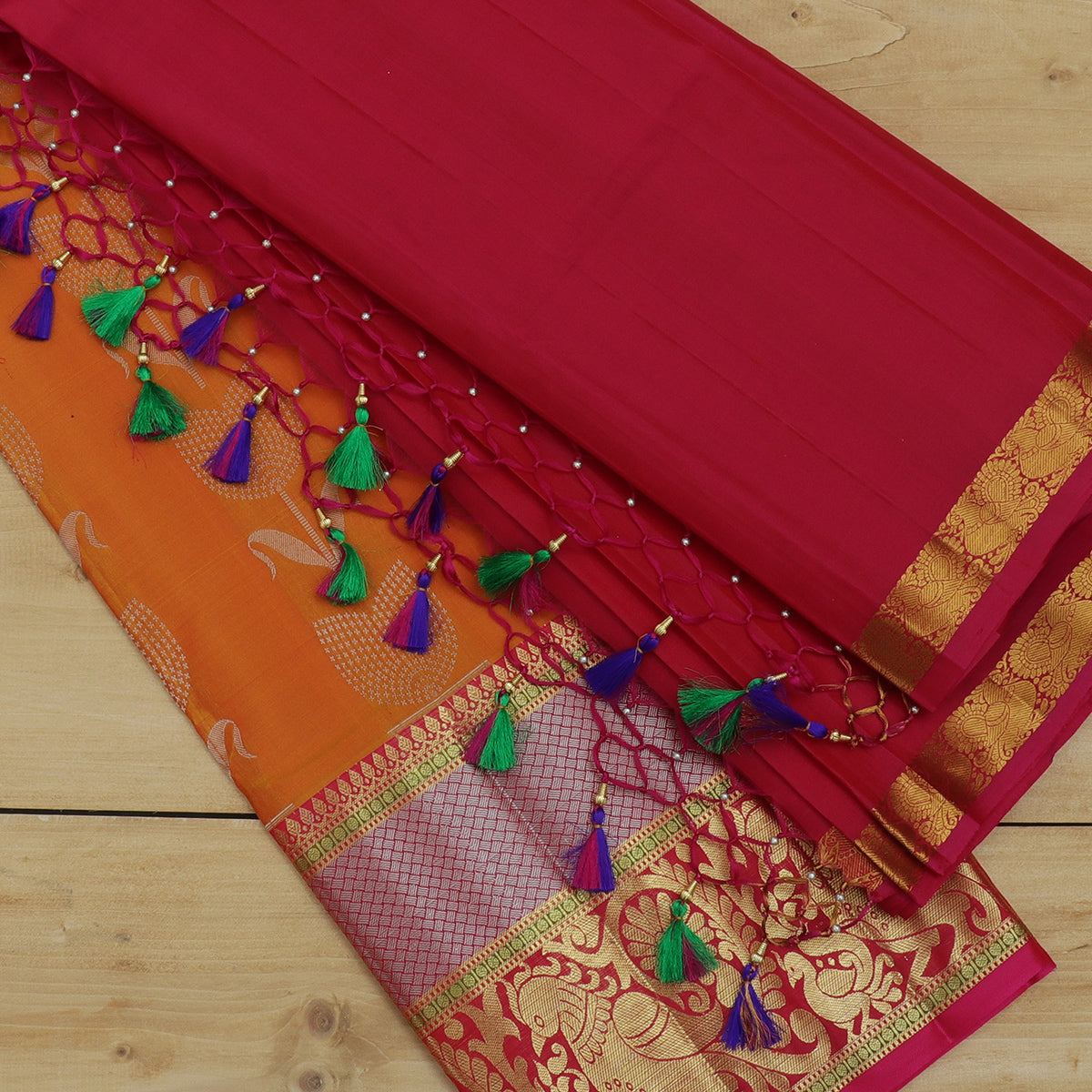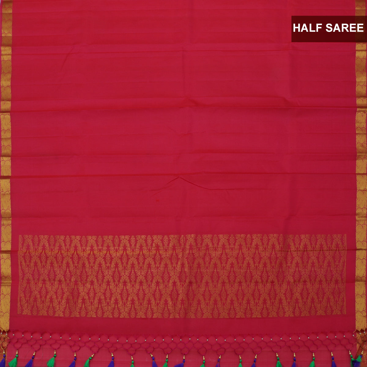 Pure silk half saree mango orange with allover silver zari floral buttas and contrast dark pink blouse & Dupatta