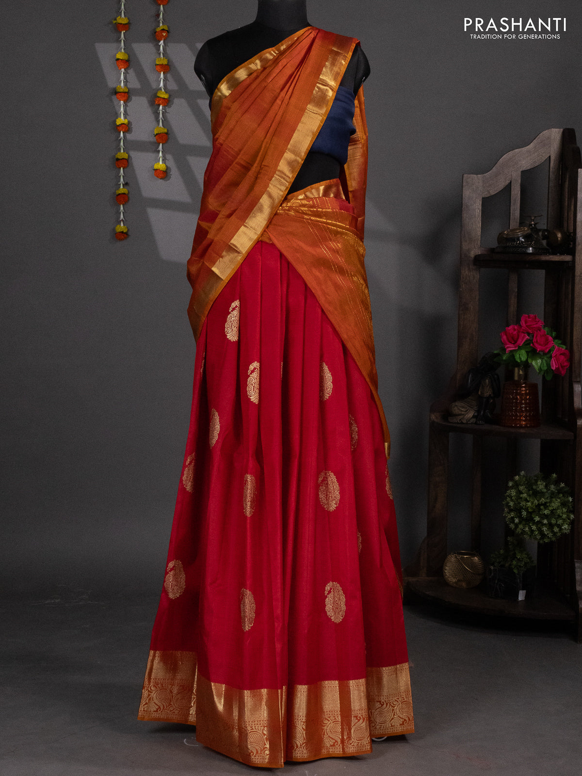 Pure silk lehenga dhawani kumkum red and dark mustard with zari woven paisley buttas and rich zari woven border