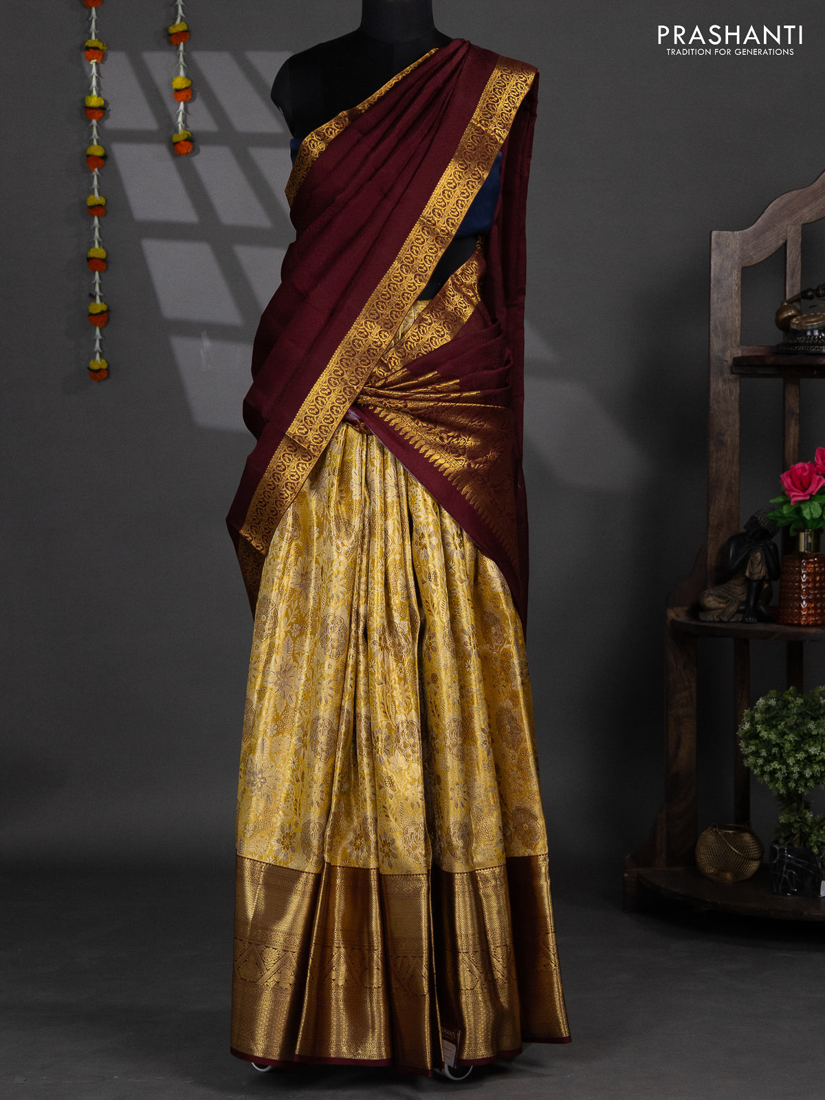 Pure silk tissue lehenga dhawani mustrad yellow and deep maroon with allover zari woven floral brocade weaves and long rich zari woven border
