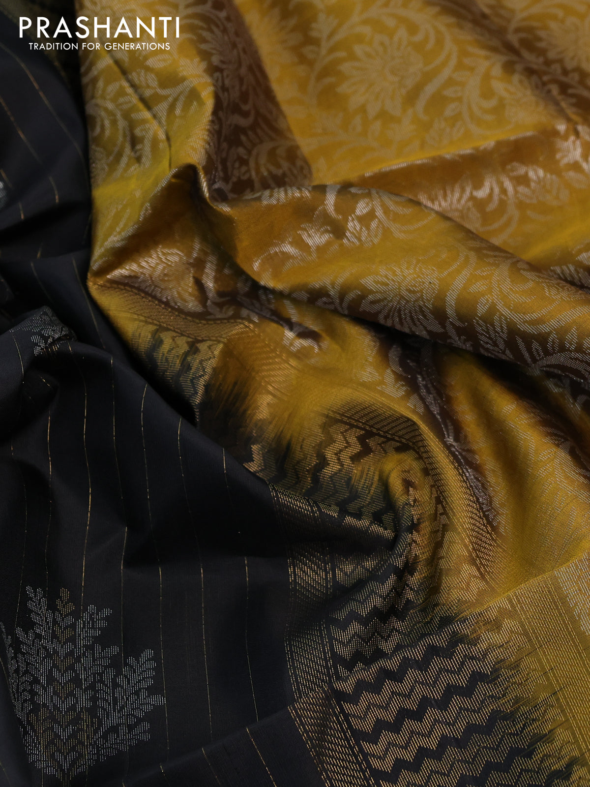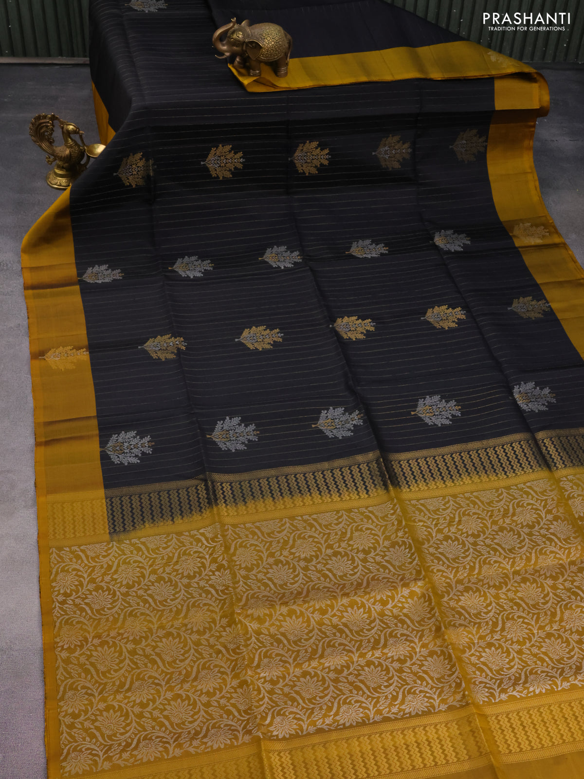 Pure soft silk saree black and mustard yellow with allover zari weaves & buttas and zari woven butta border