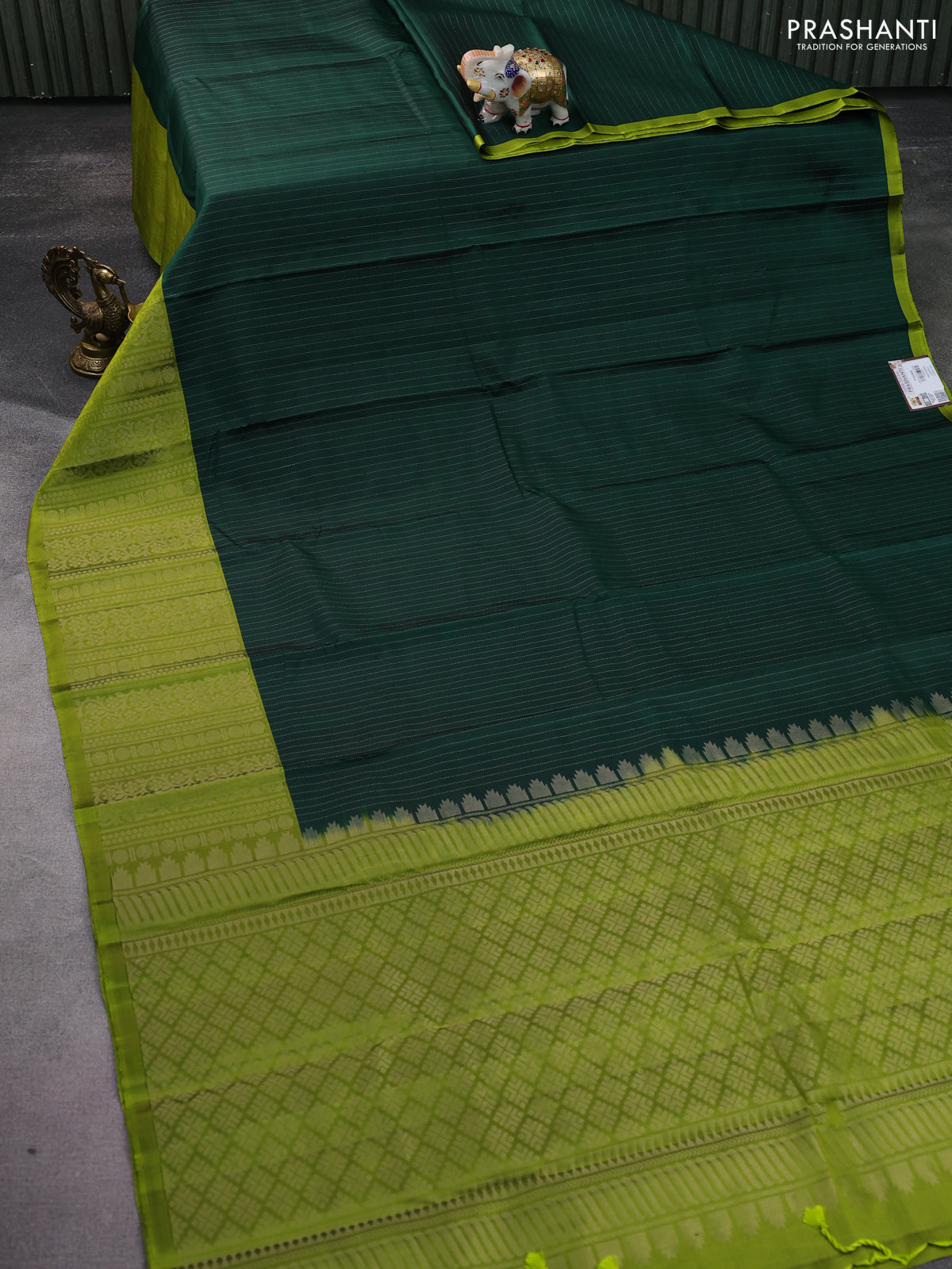 Pure soft silk saree bottle green and light green with allover zari woven strip pattern and long silver zari woven border