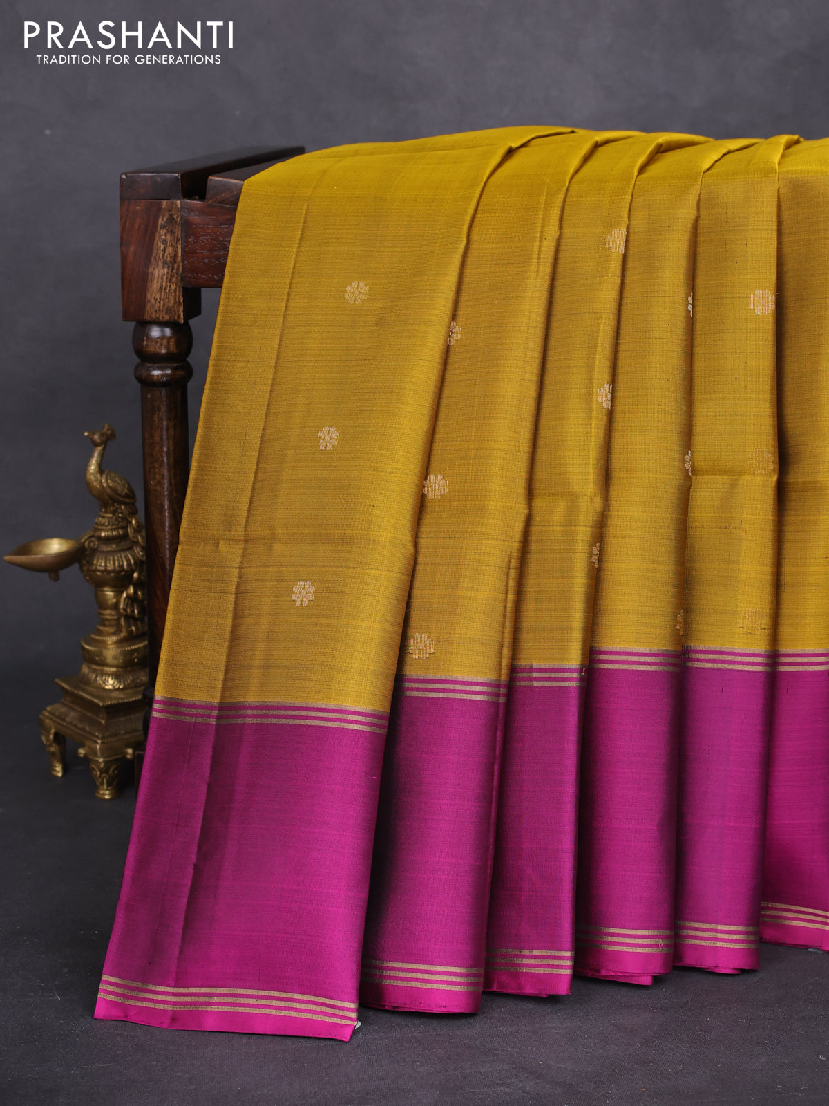 Pure soft silk saree dark mustard and purple with zari woven floral buttas and rettapet zari woven border