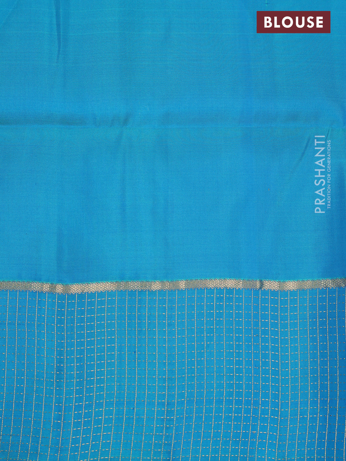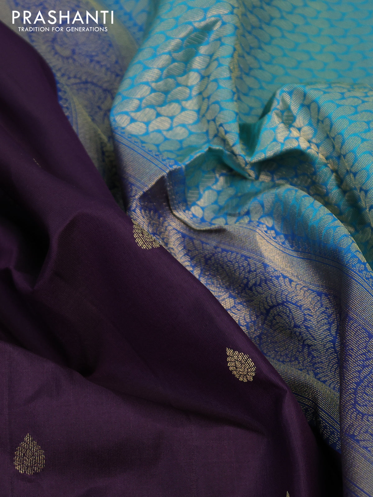 Pure soft silk saree deep purple and teal blue with allover zari woven buttas and zari woven checked border