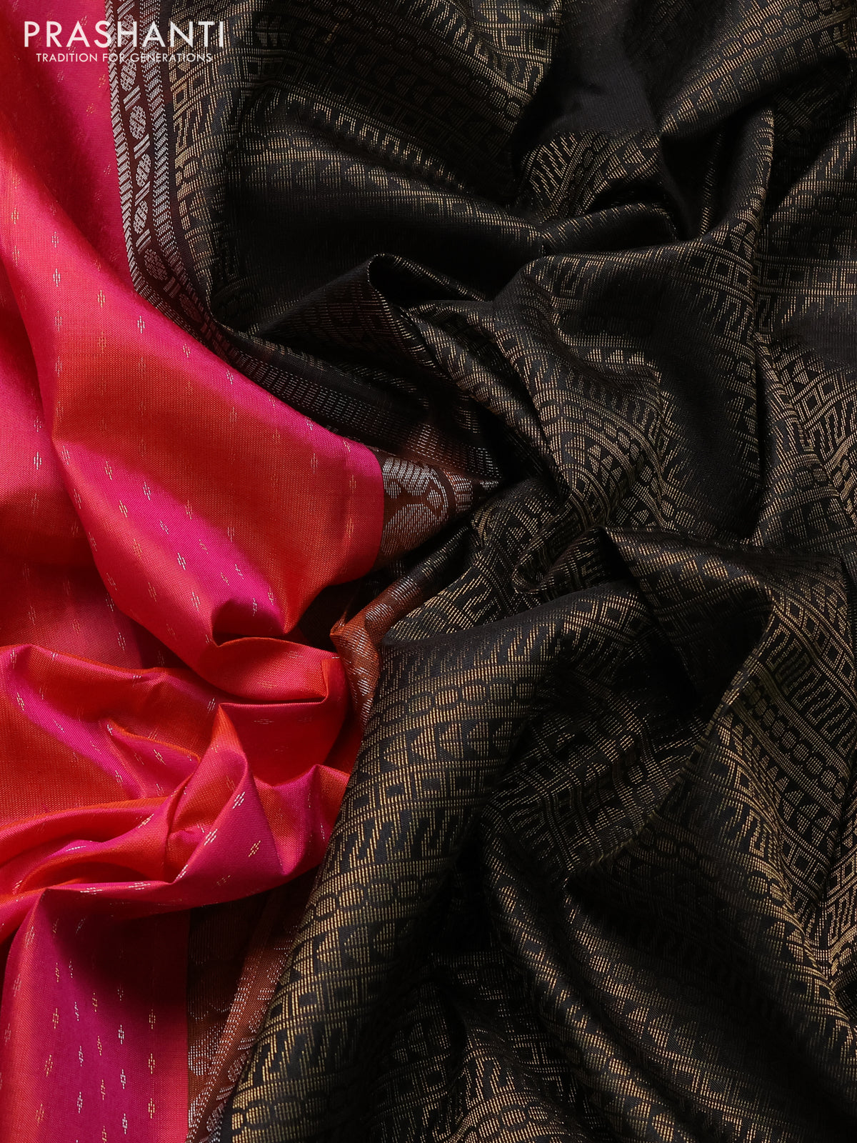 Pure soft silk saree dual shade of pinkish orange and black with allover silver & gold zari woven butta weaves and long zari woven butta border
