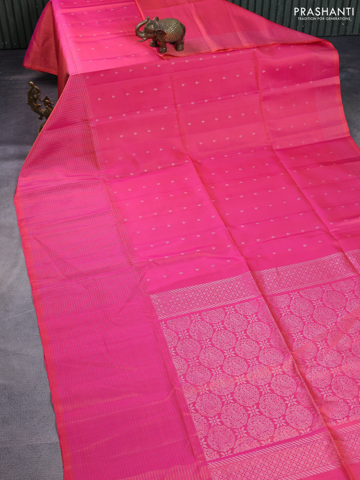 Pure soft silk saree dual shade of pinkish orange with allover silver zari buttas and long zari checked border