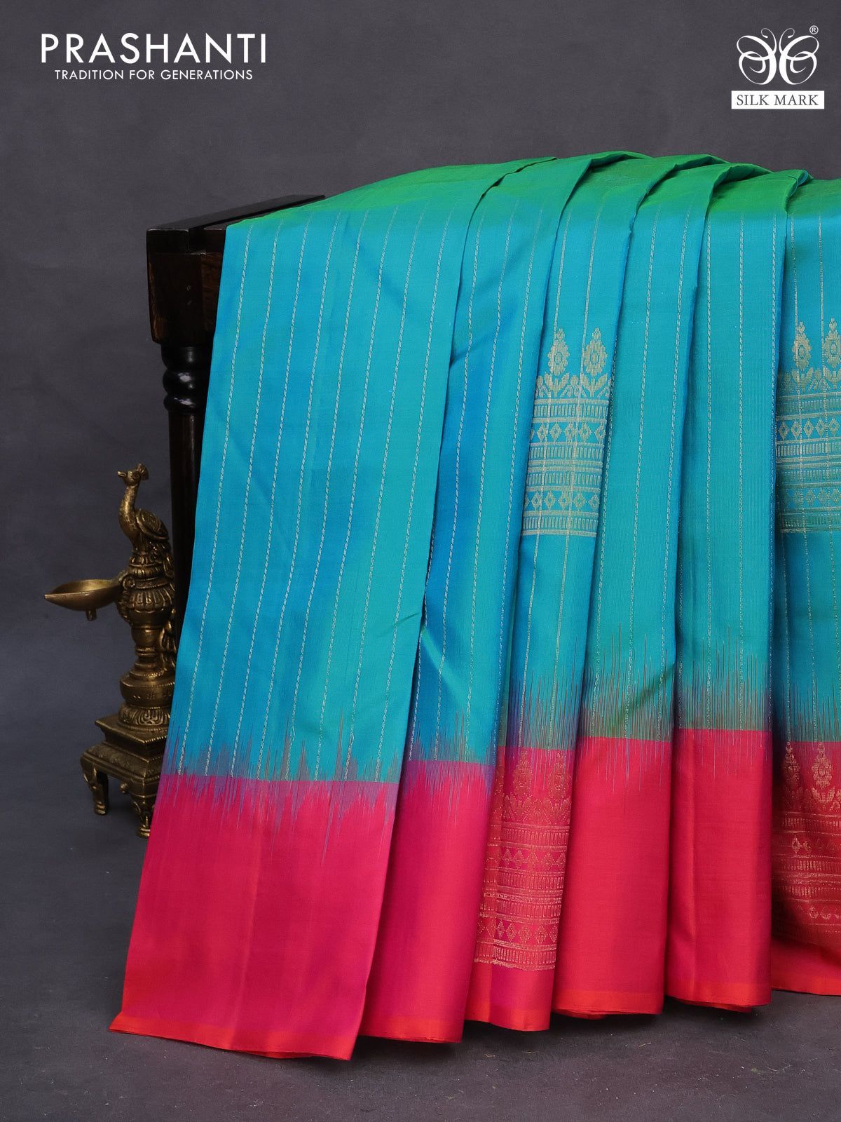 Pure soft silk saree dual shade of teal blue and dual shade of pinkish orange with allover zari weaves and silver zari woven border