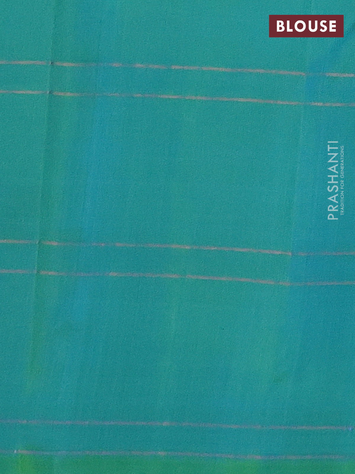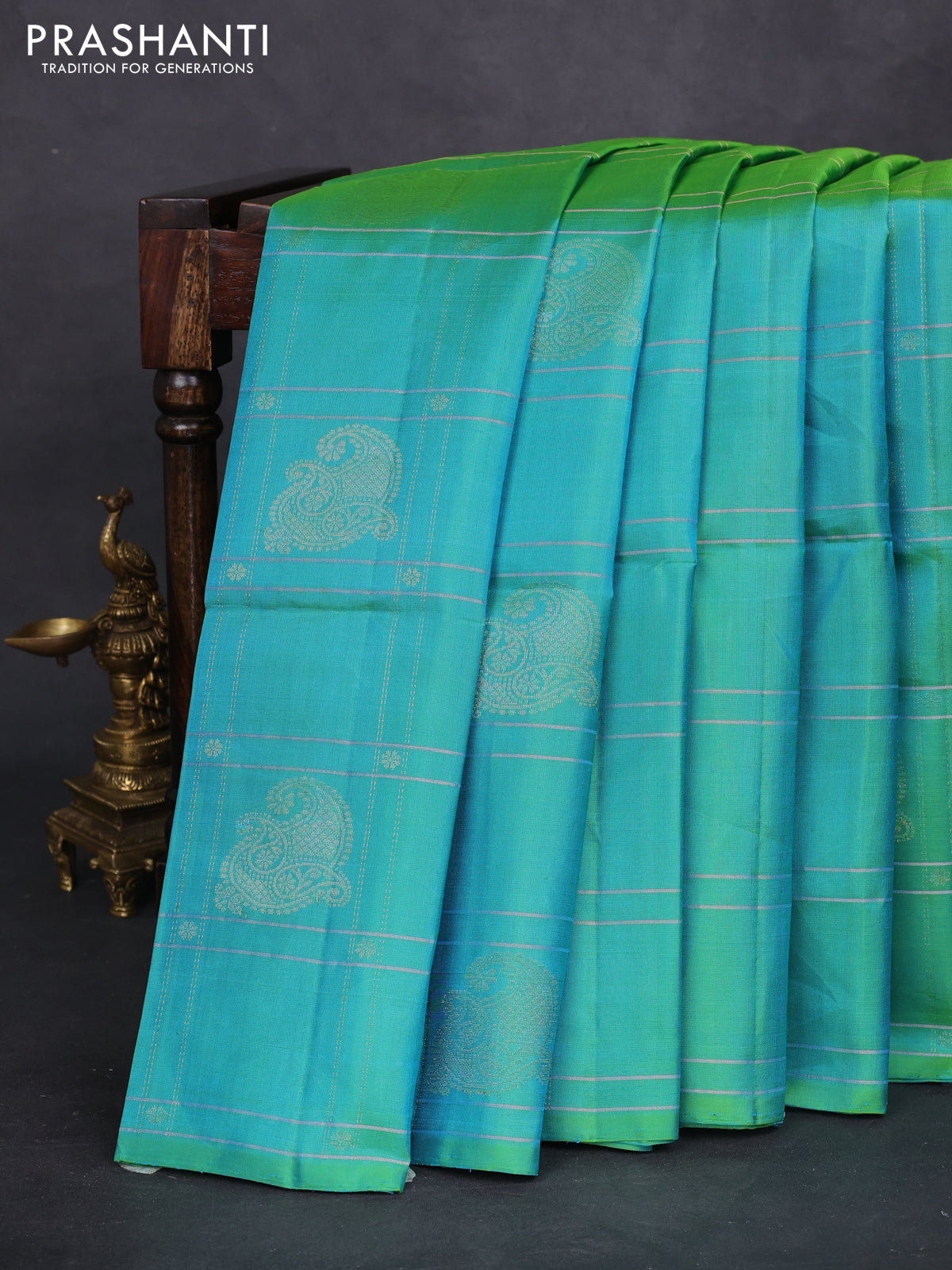 Pure soft silk saree dual shade of teal bluish green with allover zari checks & buttas in borderless style
