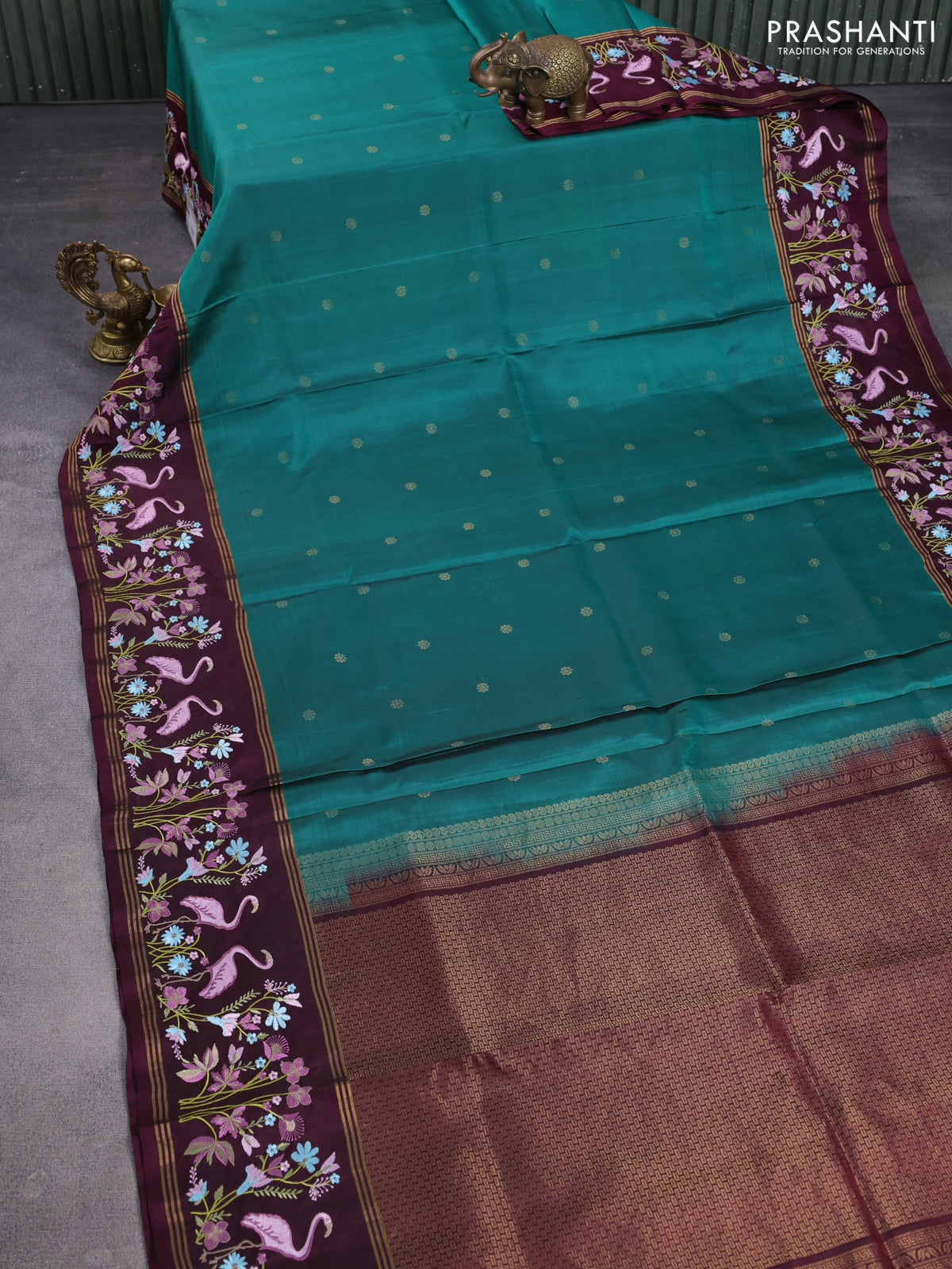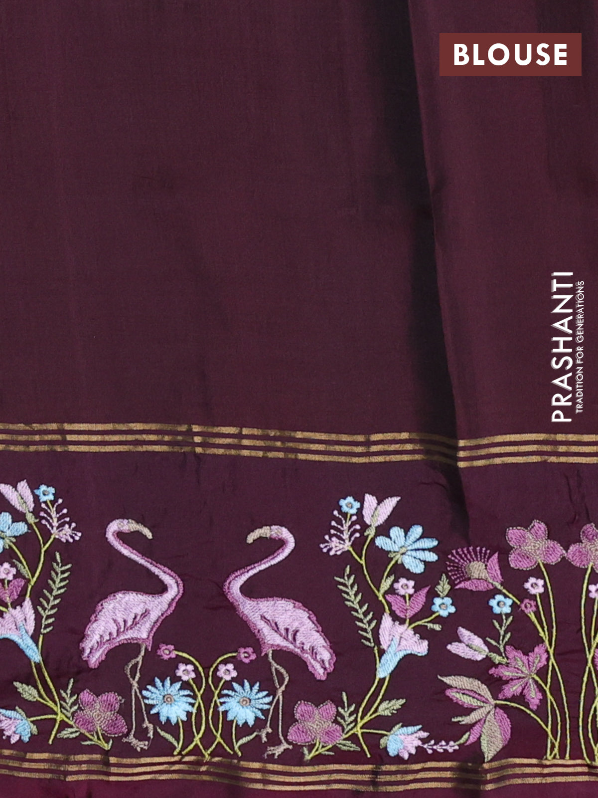 Pure soft silk saree green and wine shade with zari woven buttas and zari woven kutch embroidery
