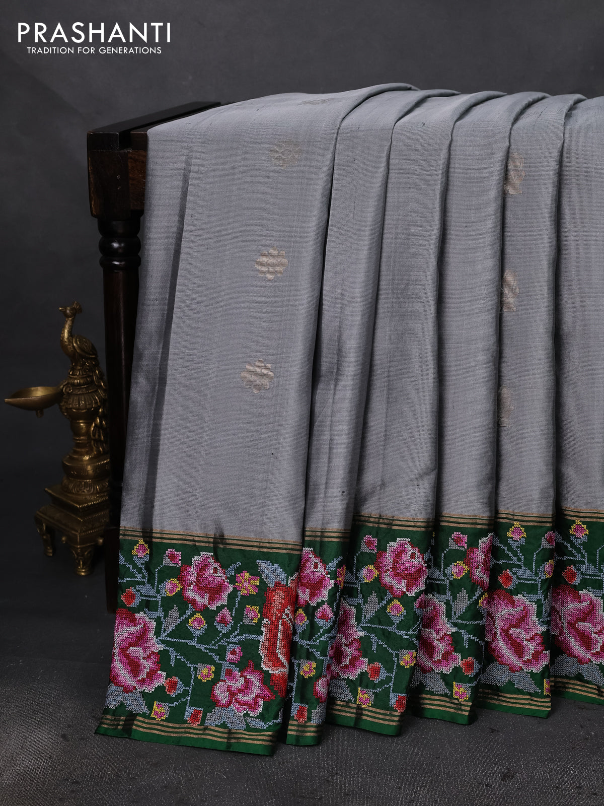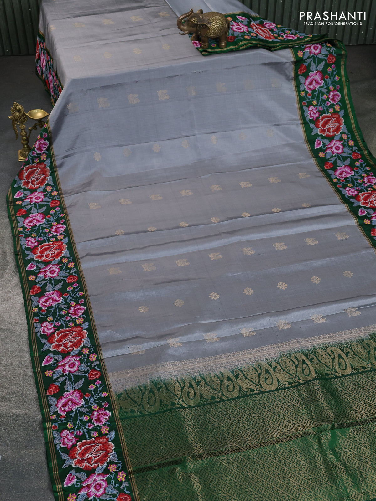 Pure soft silk saree grey and green with annam zari woven buttas and embroidery border