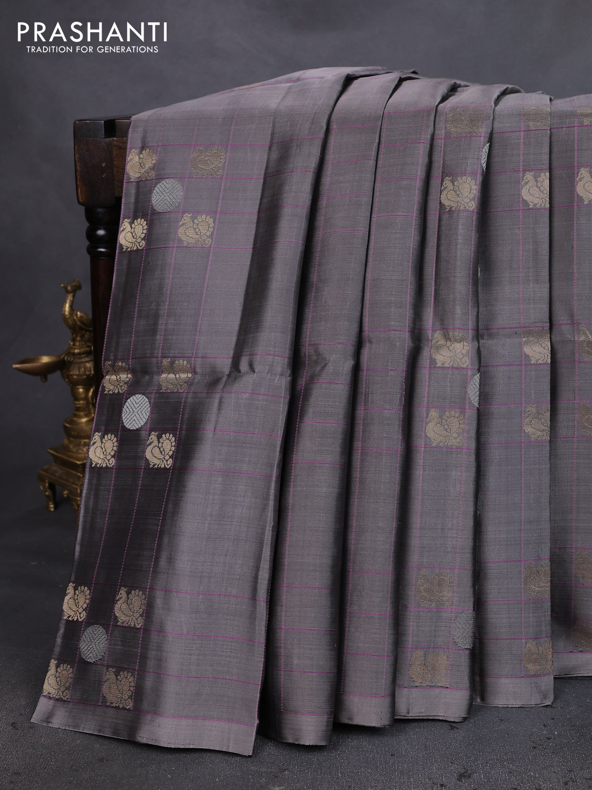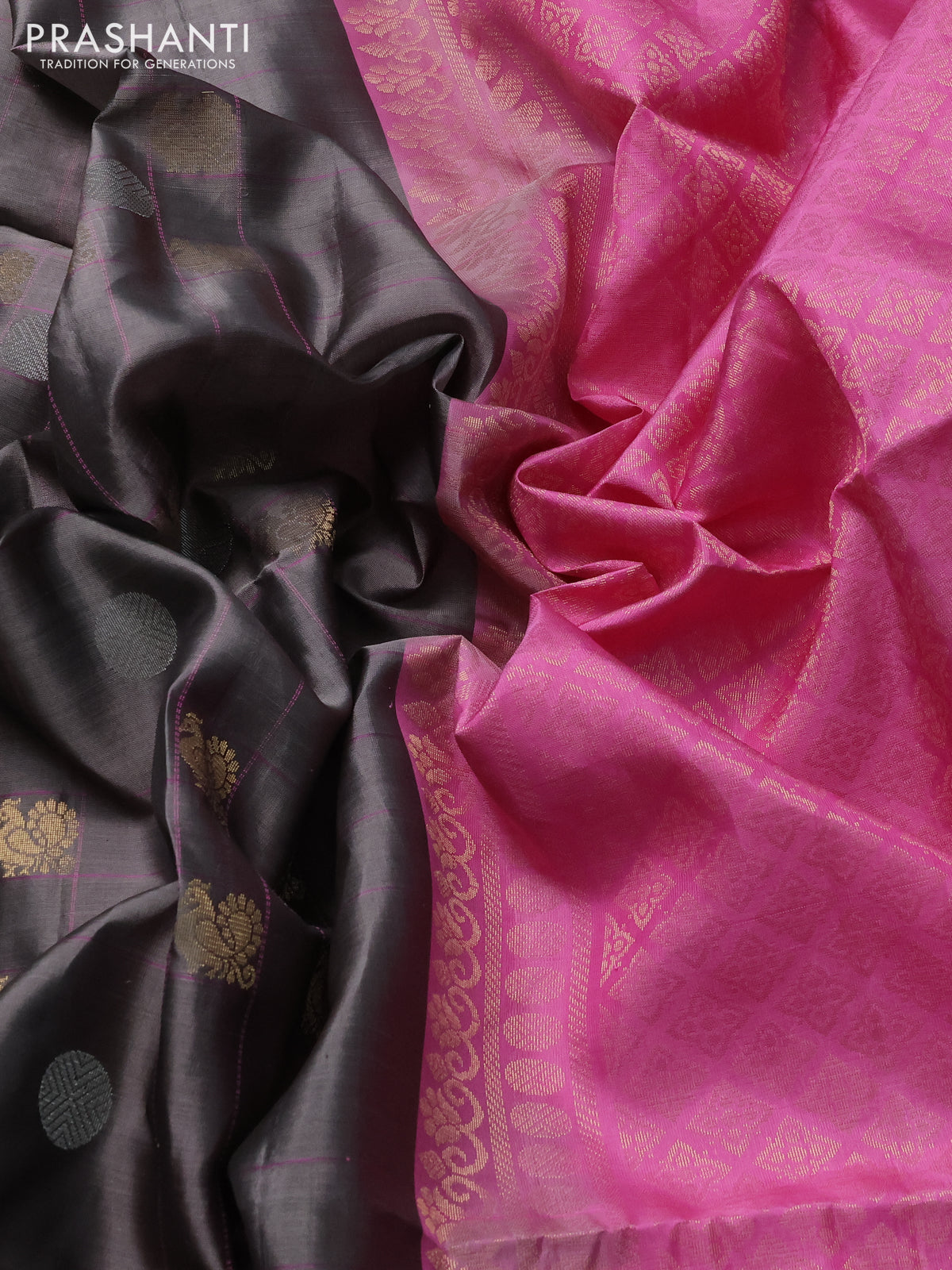 Pure soft silk saree grey and light pink with allover checks & zari buttas in borderless style