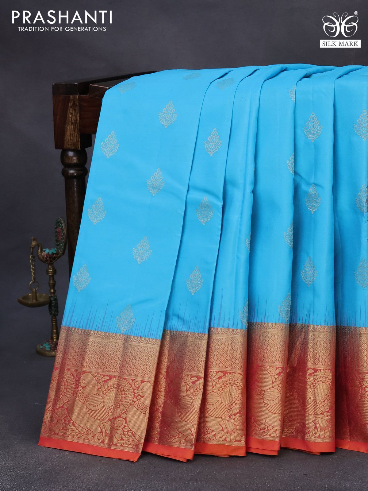 Pure soft silk saree light blue and dual shade of pinkish orange with zari woven buttas and rich zari woven annam border