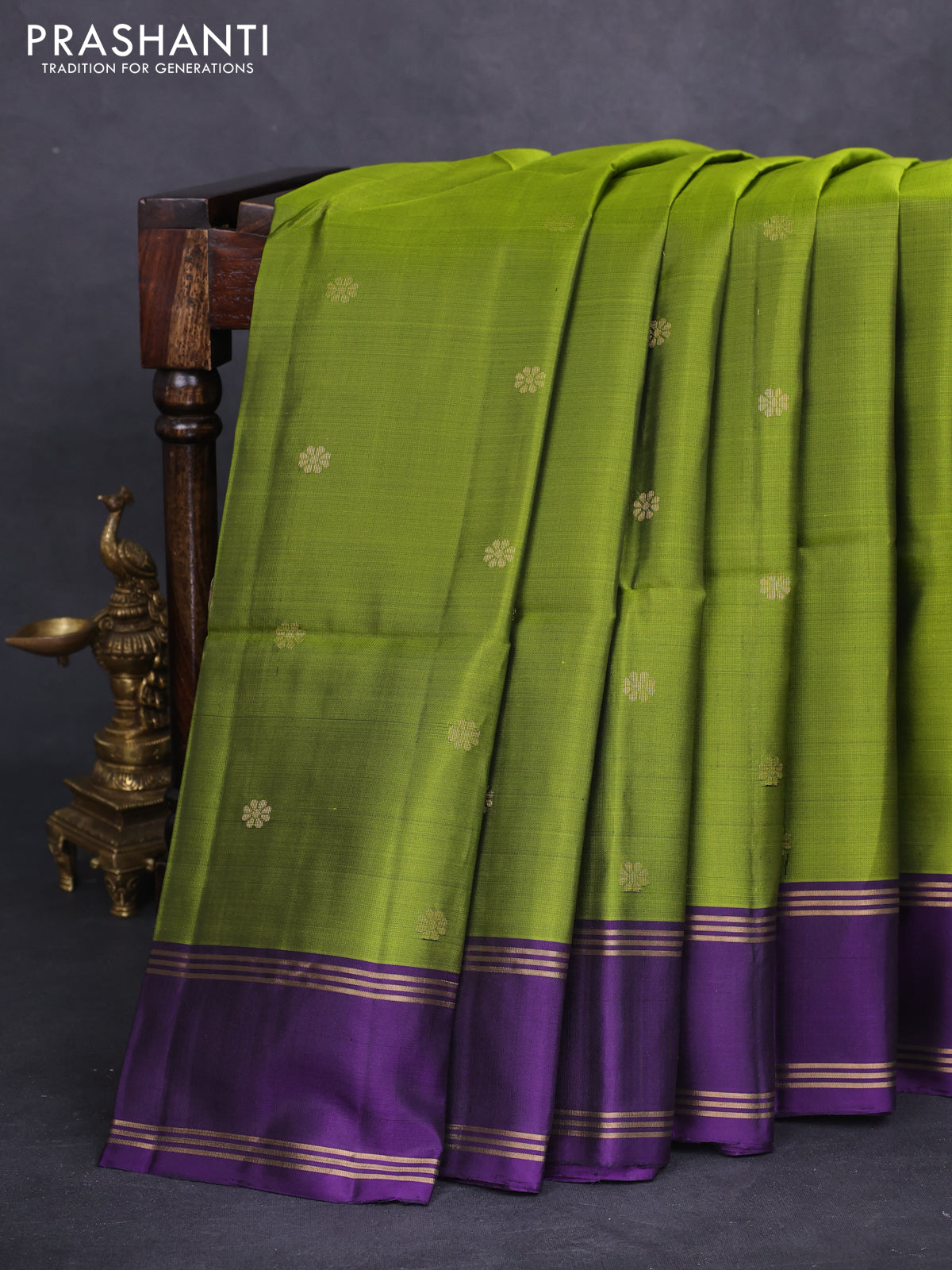 Pure soft silk saree light green and purple with zari woven floral buttas and rettapet zari woven border