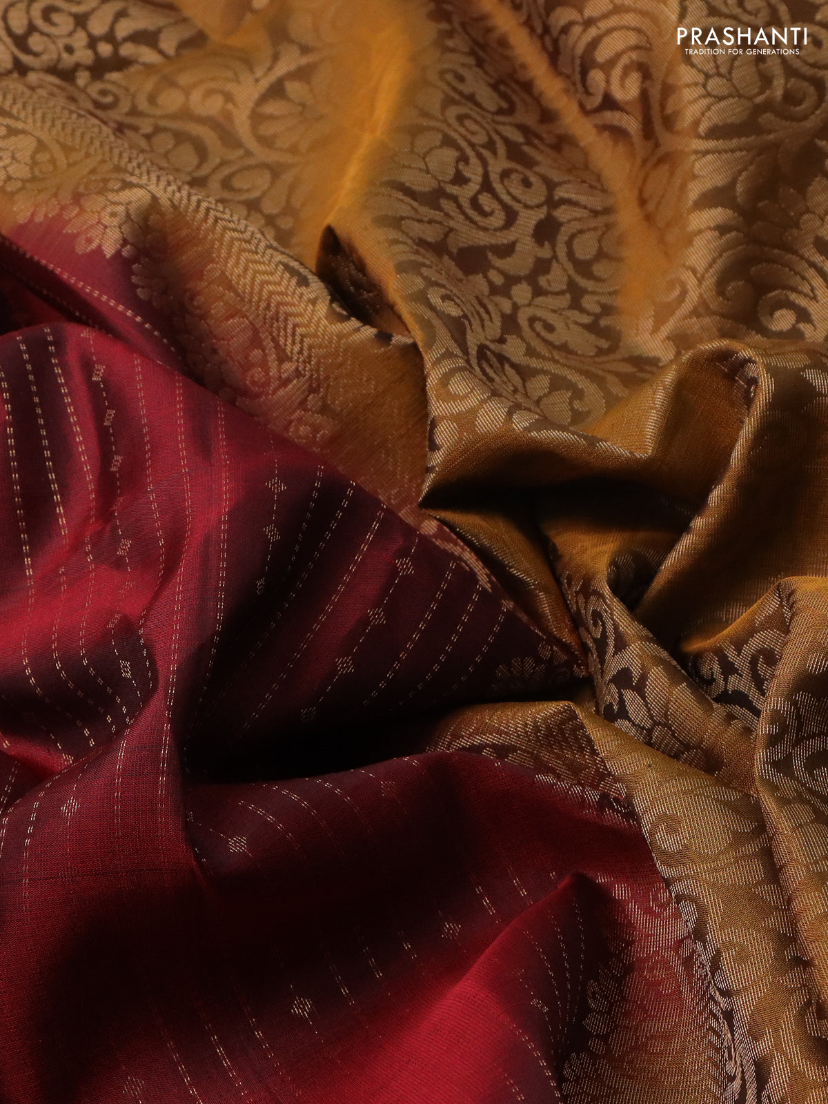 Pure soft silk saree maroon and dark mustard with allover zari weaves and rettapet zari woven border