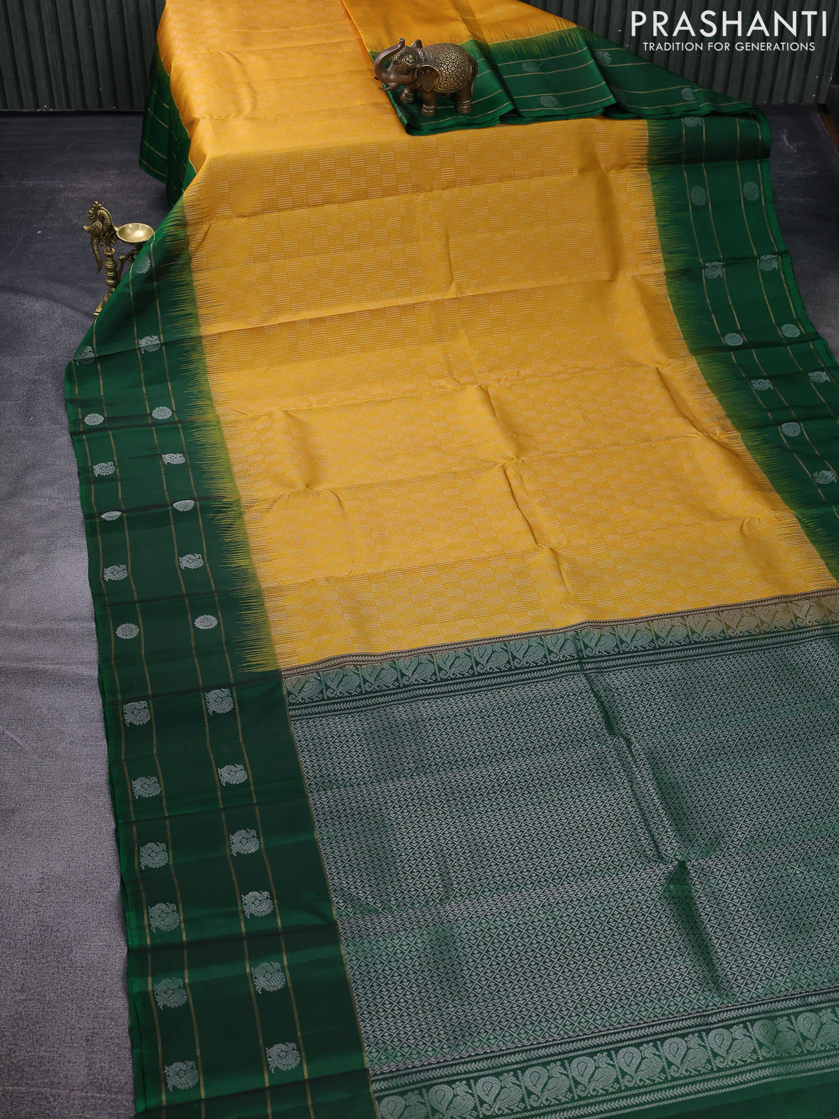 Pure soft silk saree mustard yellow and green with allover zari weaves and zari woven butta border
