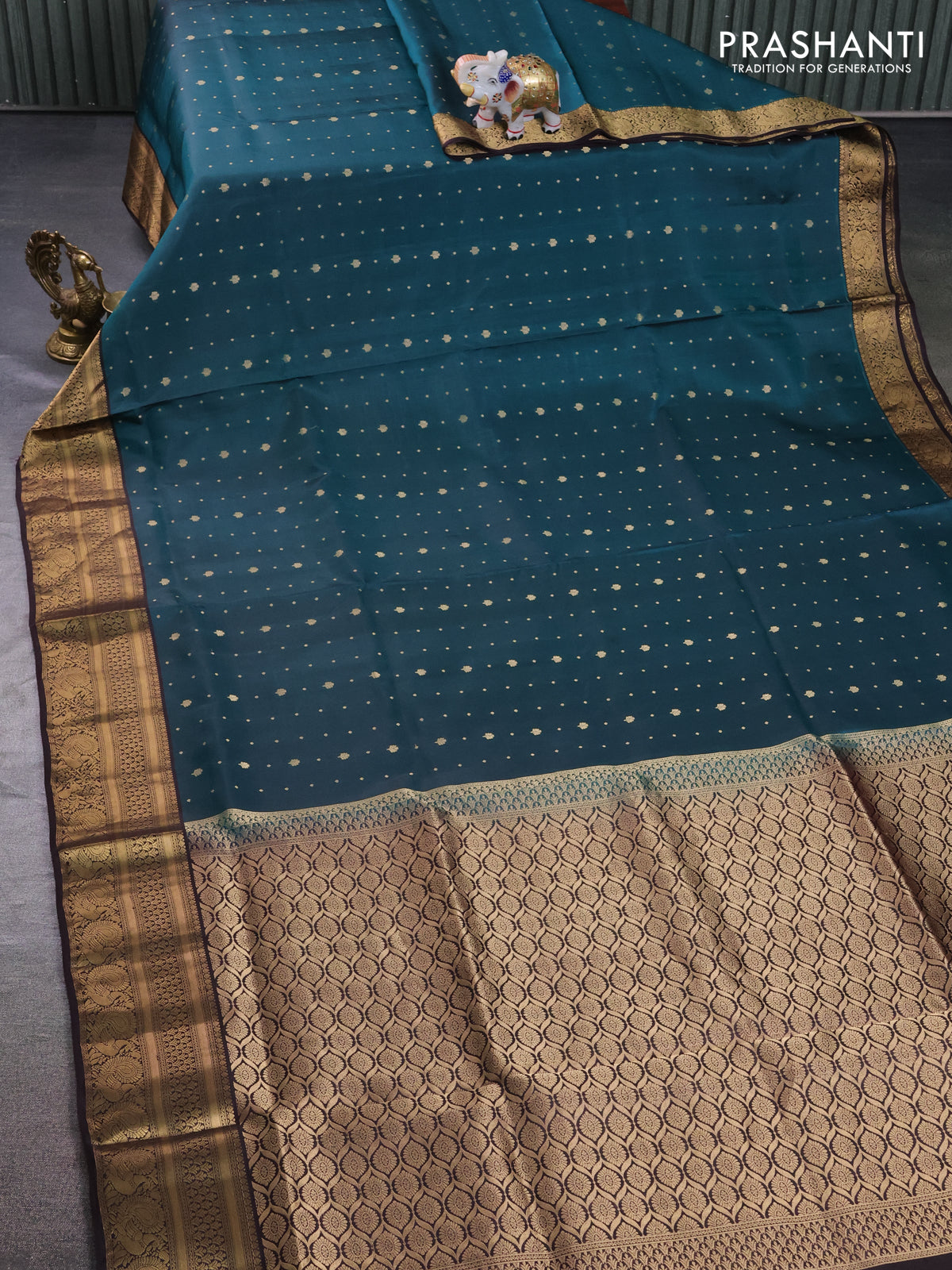Pure soft silk saree peacock green and coffee brown with allover zari woven buttas and zari woven border