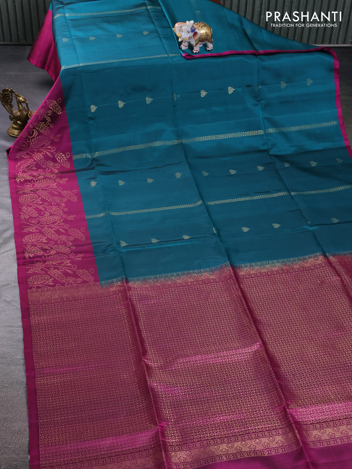 Pure soft silk saree peacock green and magenta pink with zari woven buttas and rich zari woven border