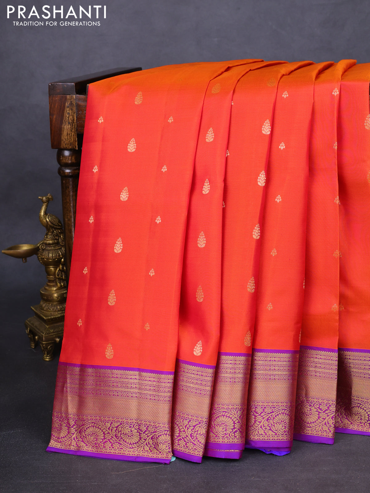 Pure soft silk saree sunset orange and blue with allover zari woven buttas and zari woven border