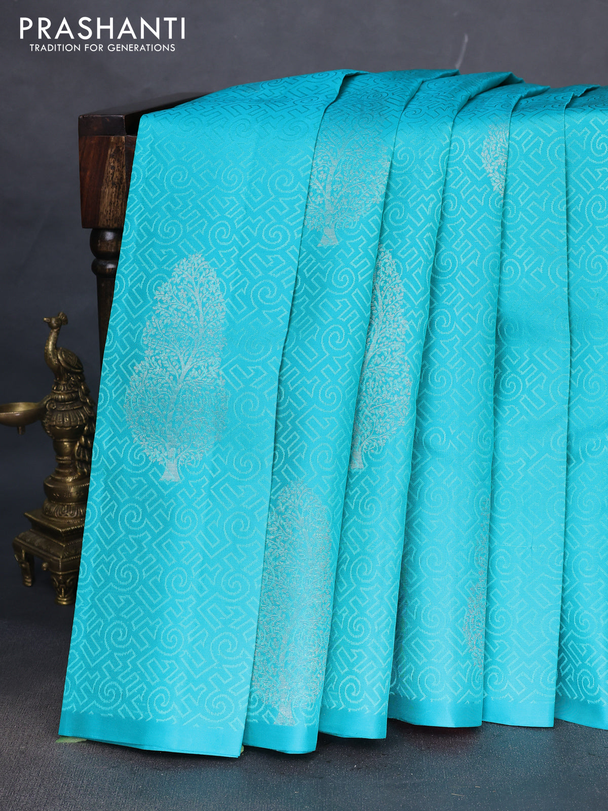 Pure soft silk saree teal blue and dual shade of pinkish orange with allover self emboss in borderless style