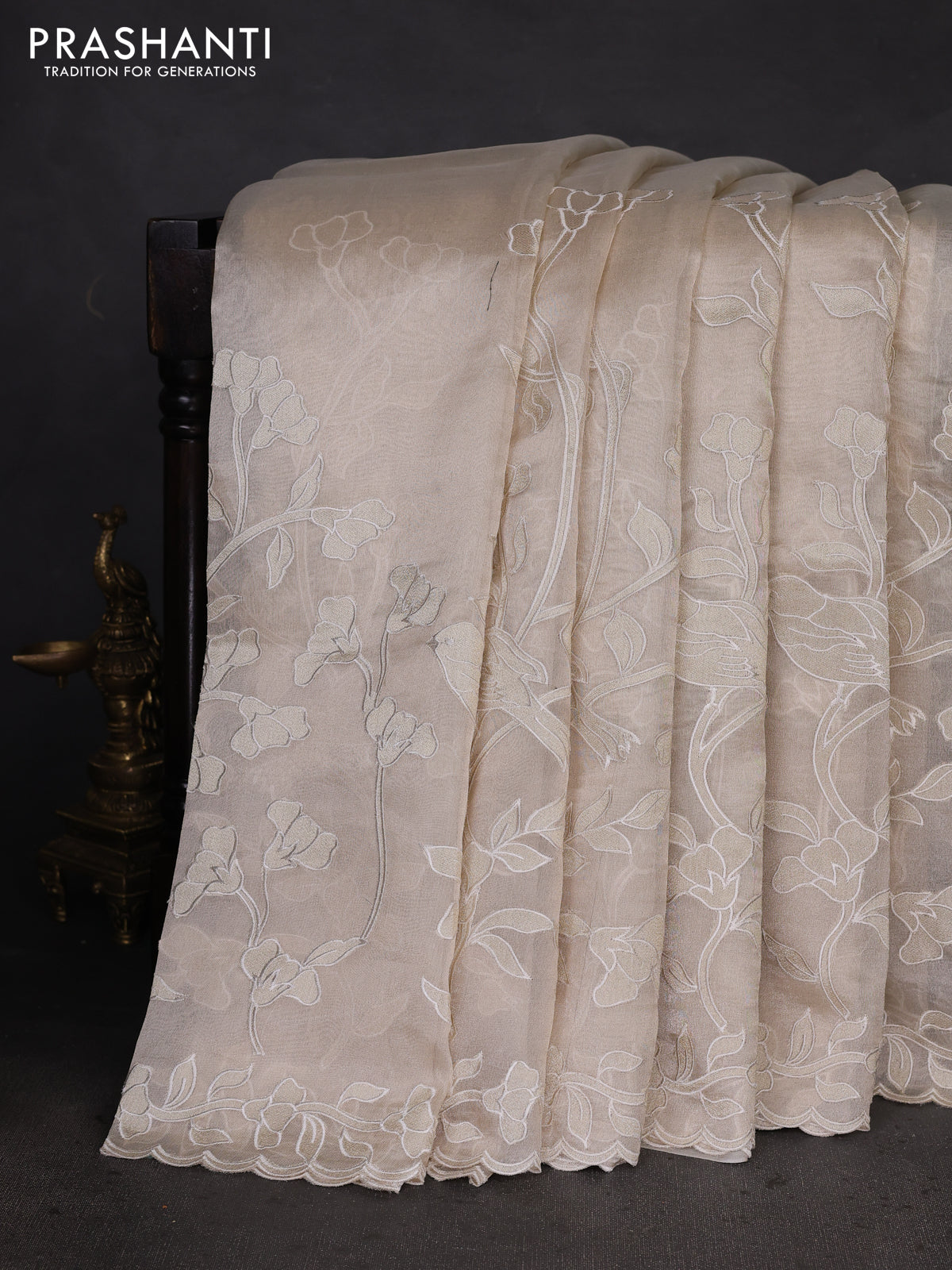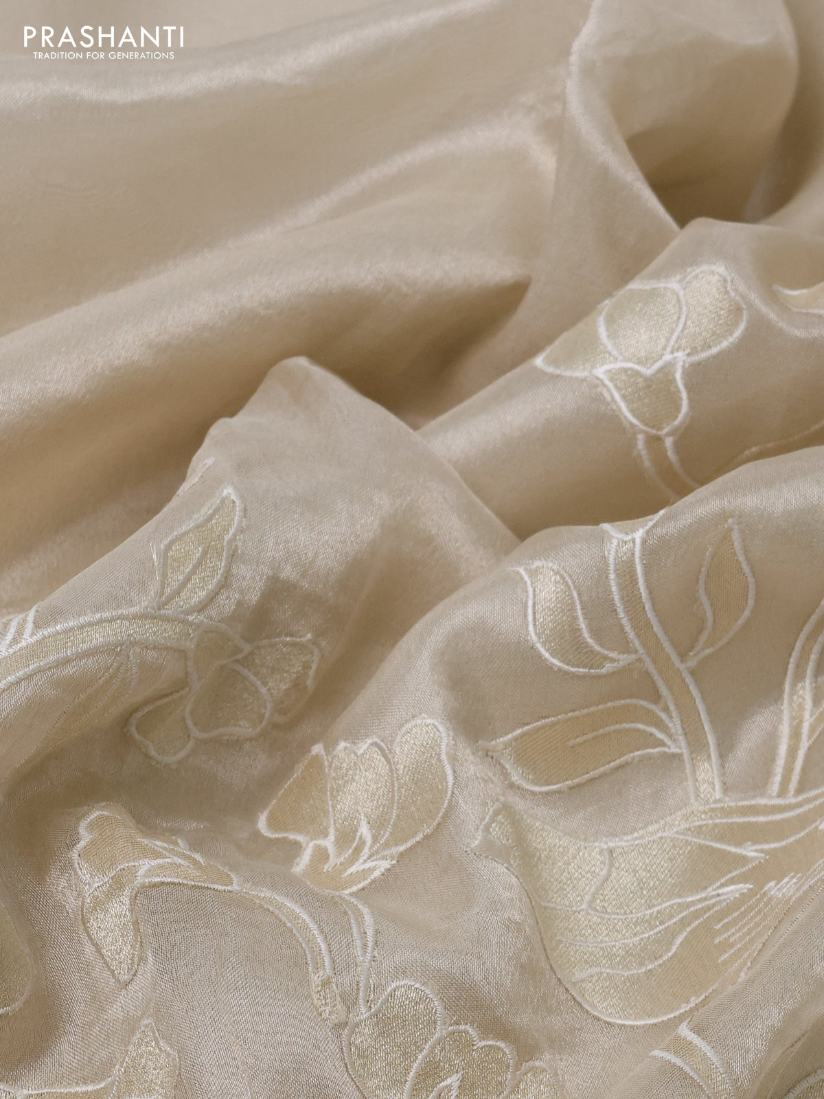 Pure tissue silk saree beige with applique work and scallop border