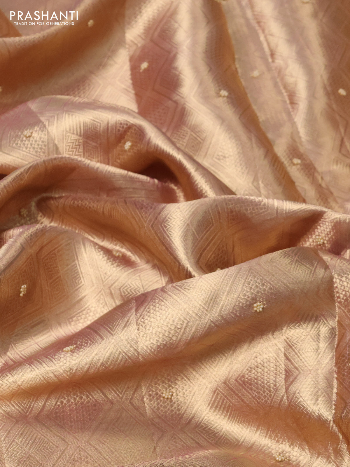 Pure tissue silk saree dual shade of pinkish gold with allover zari woven brocade weaves & beaded work and beaded work border