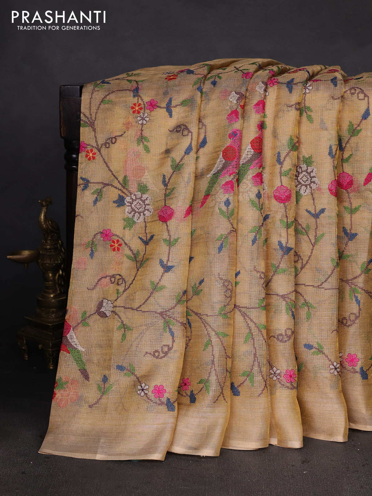 Pure tissue silk saree gold with allover convent embroidery work and simple border