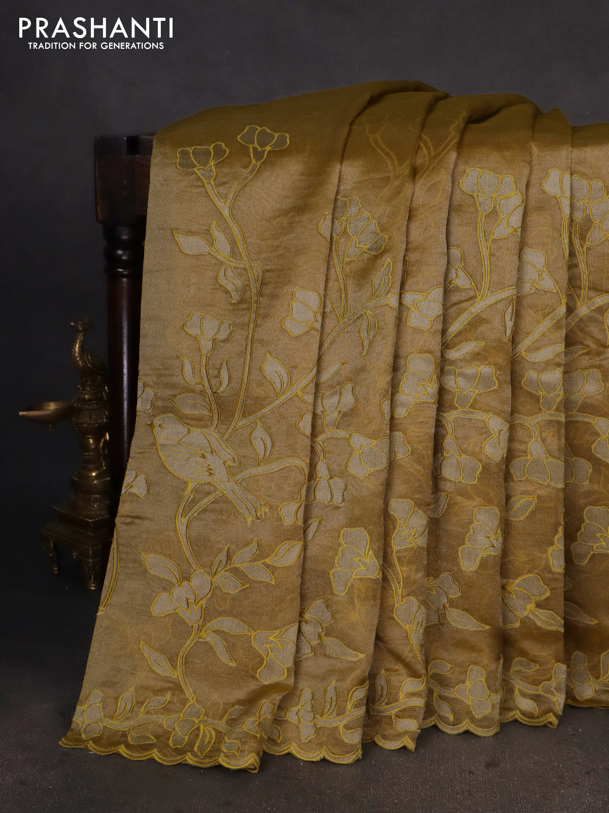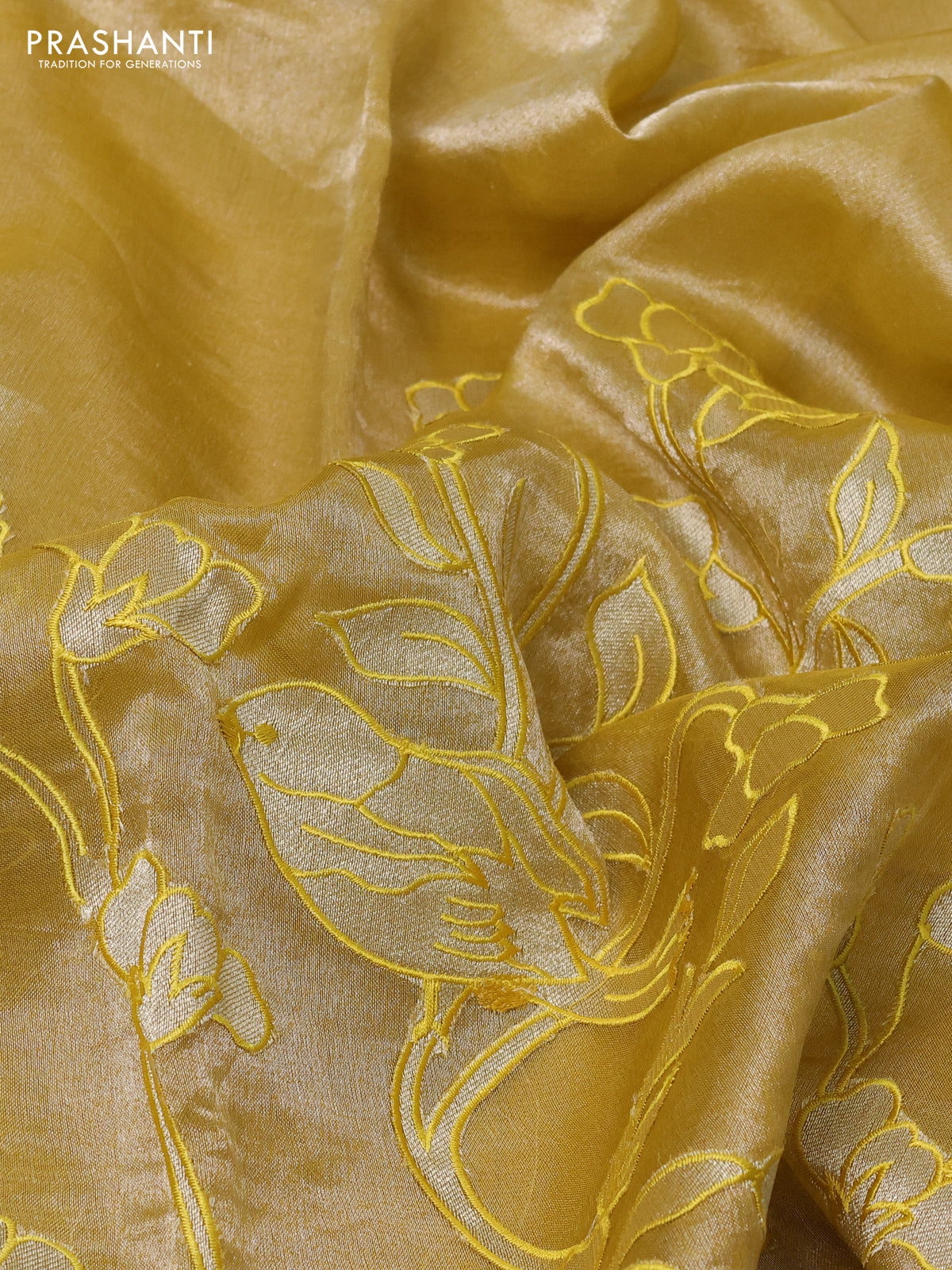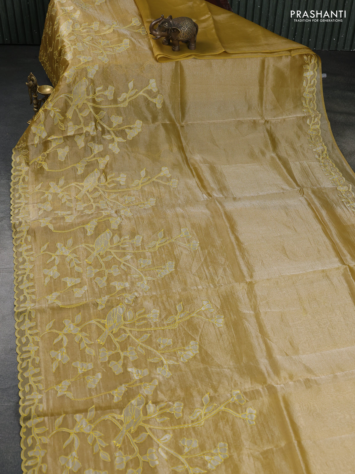 Pure tissue silk saree mustard yellow with applique work and scallop border