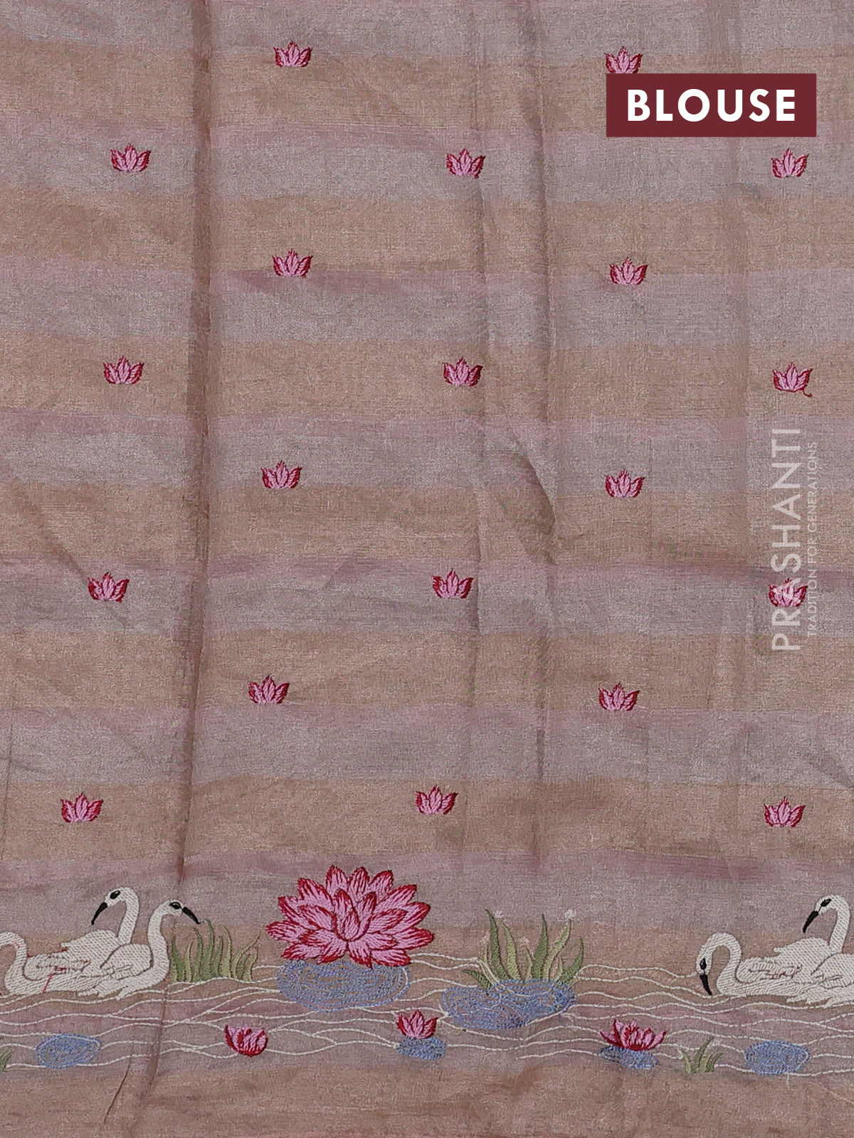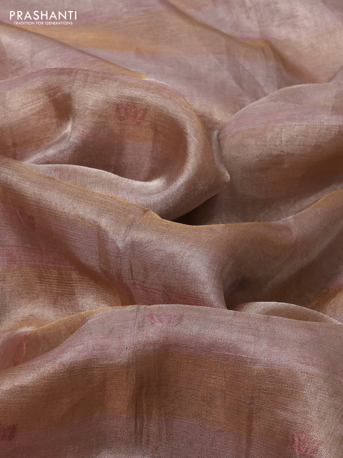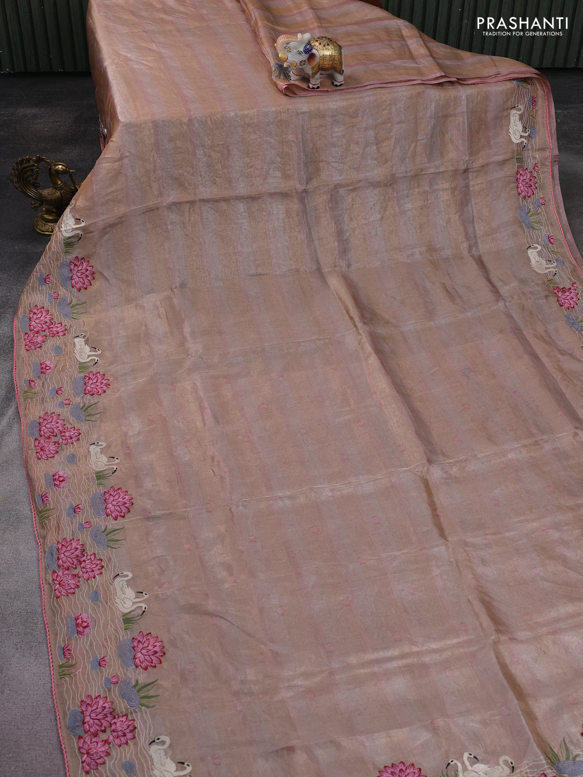 Pure tissue silk saree pastel peach pink with allover stripe pattern and embroidery border