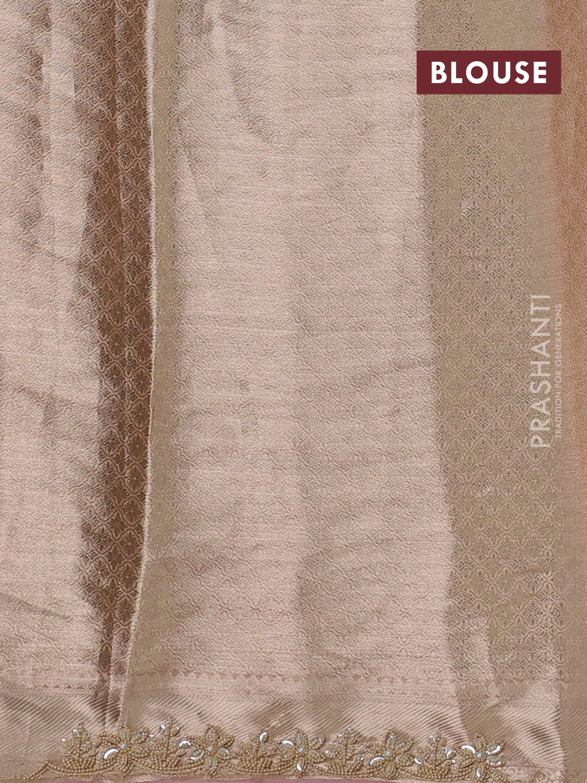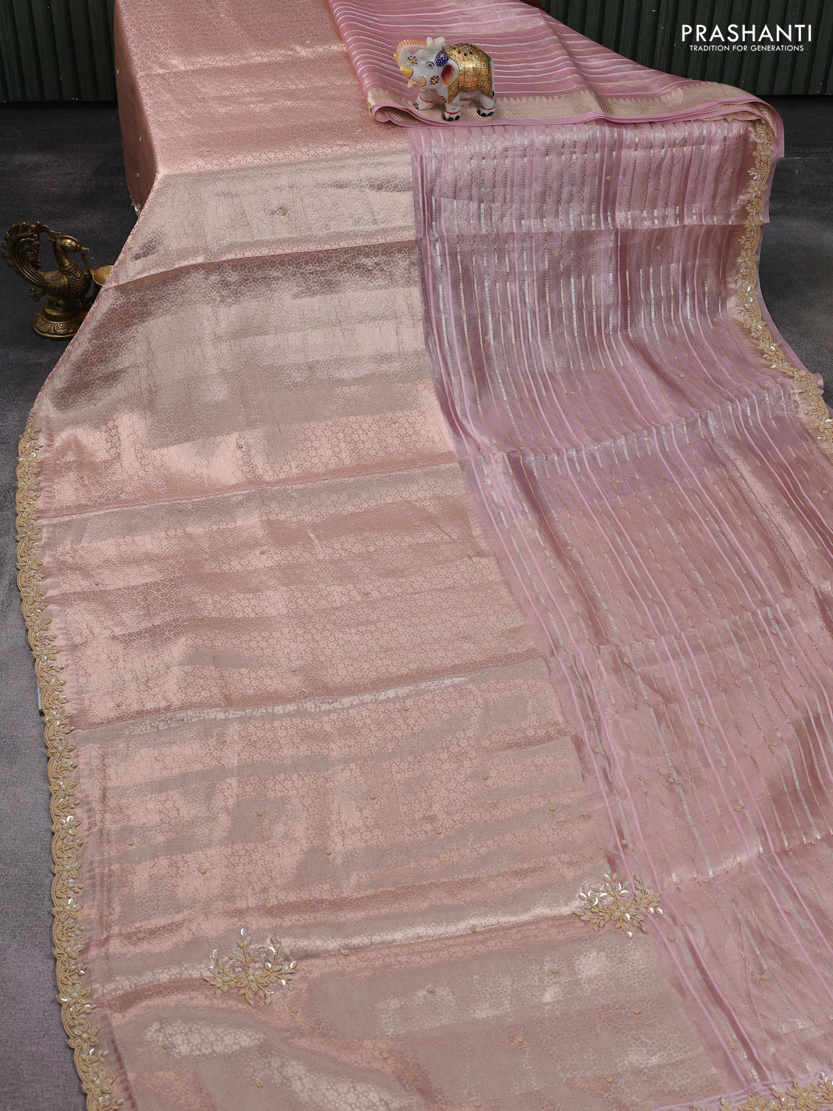 Pure tissue silk saree pastel peach pink with Half & half style zari weaves and beaded work border