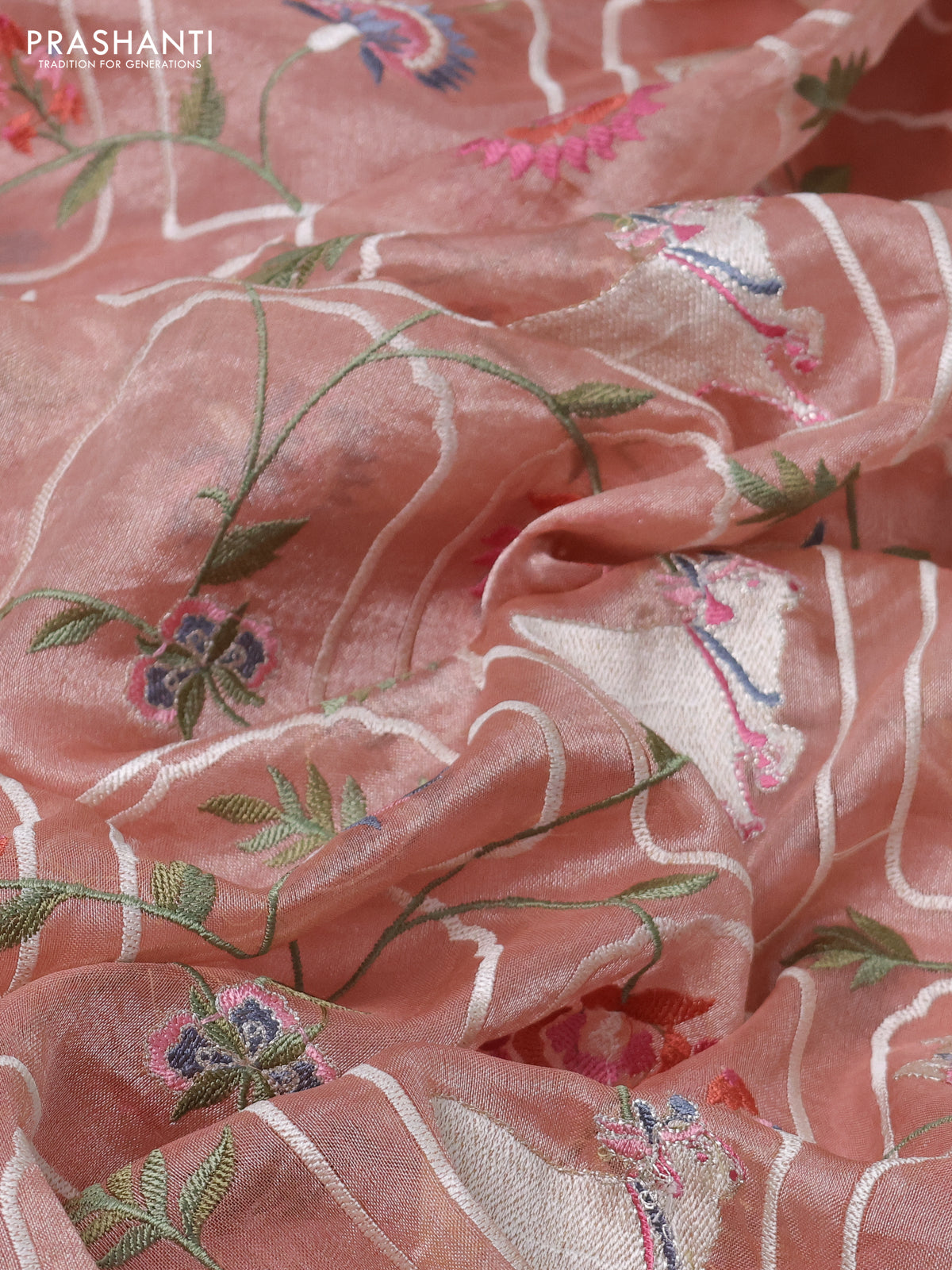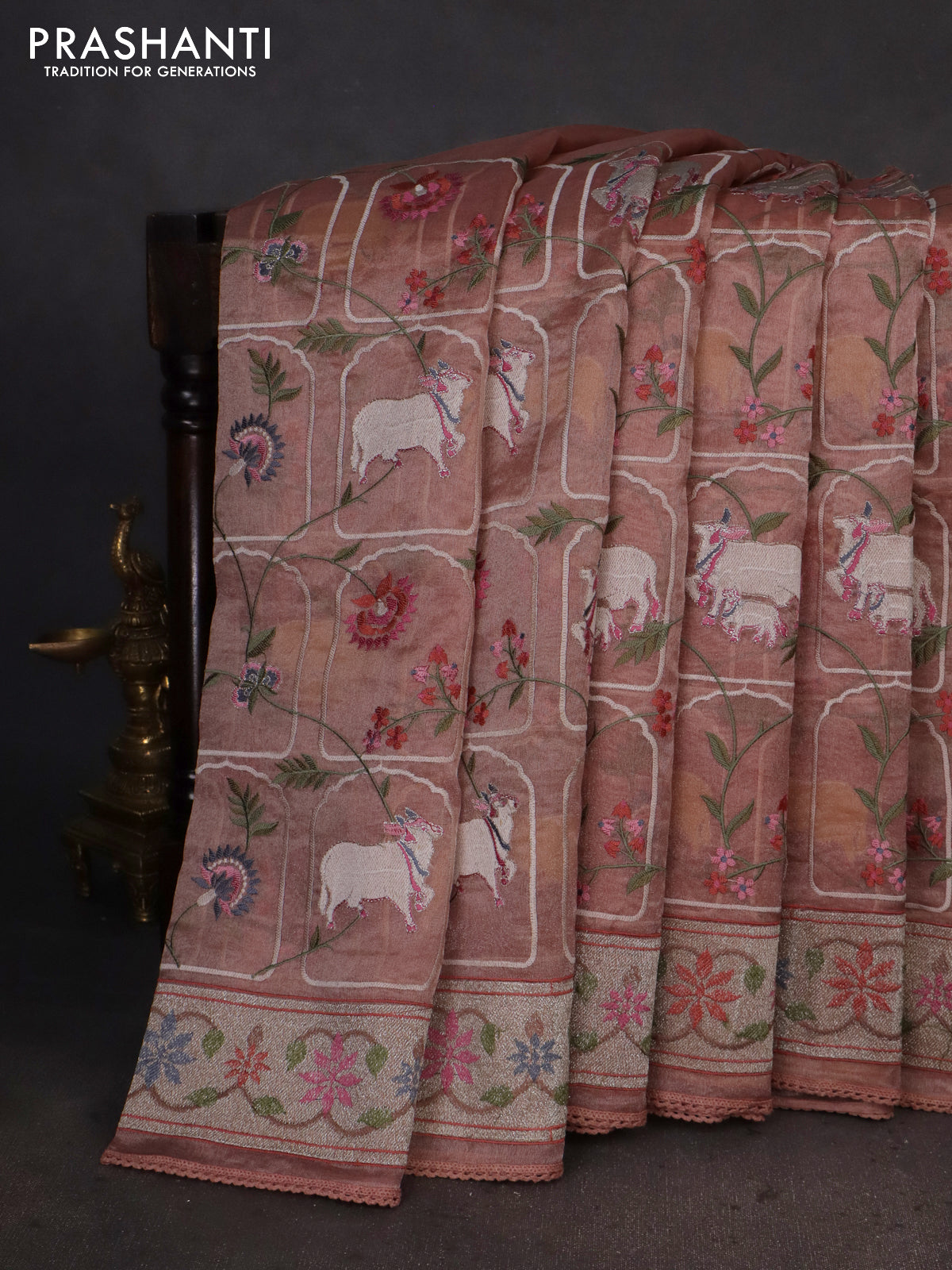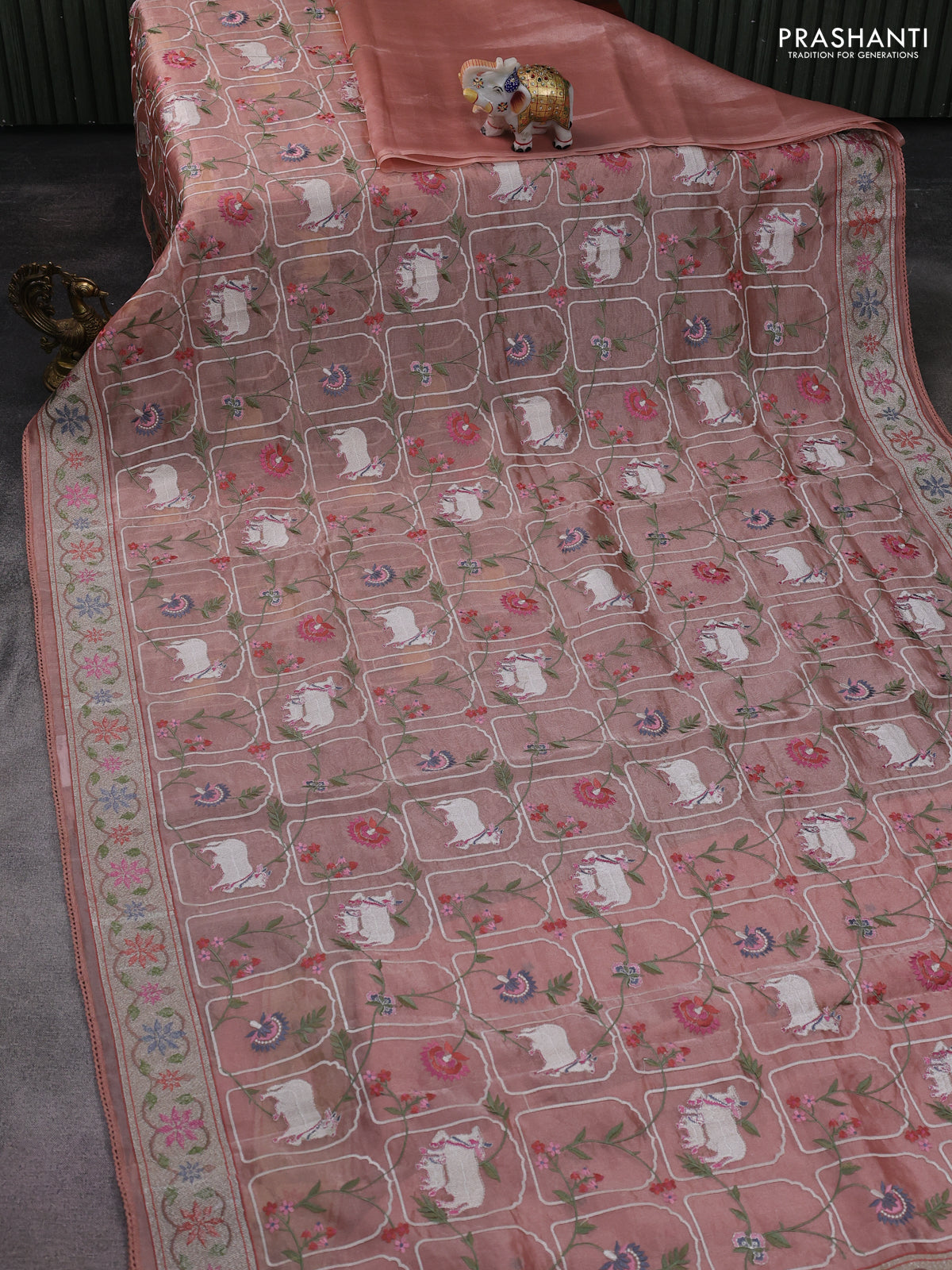 Pure tissue silk saree pastel peach with allover pichwai embroidery work and embroidery border