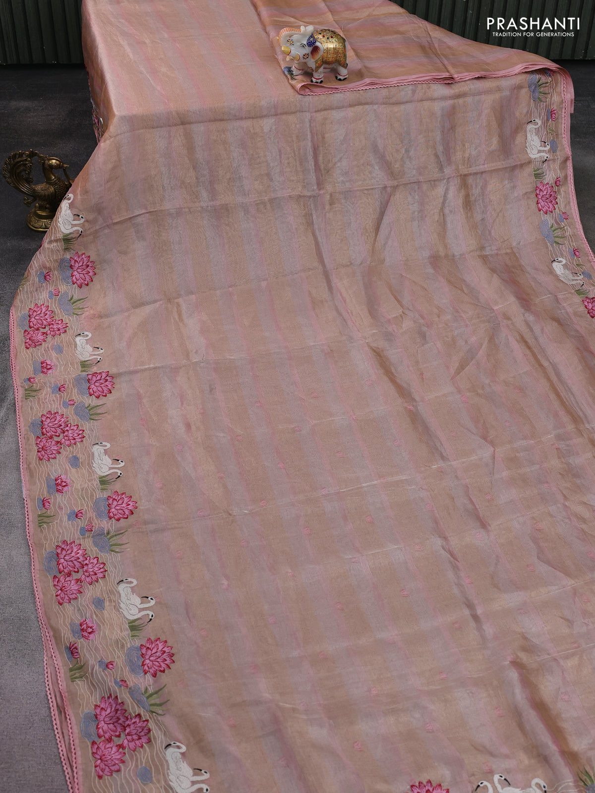 Pure tissue silk saree pastel peach with allover stripe pattern and embroidery border