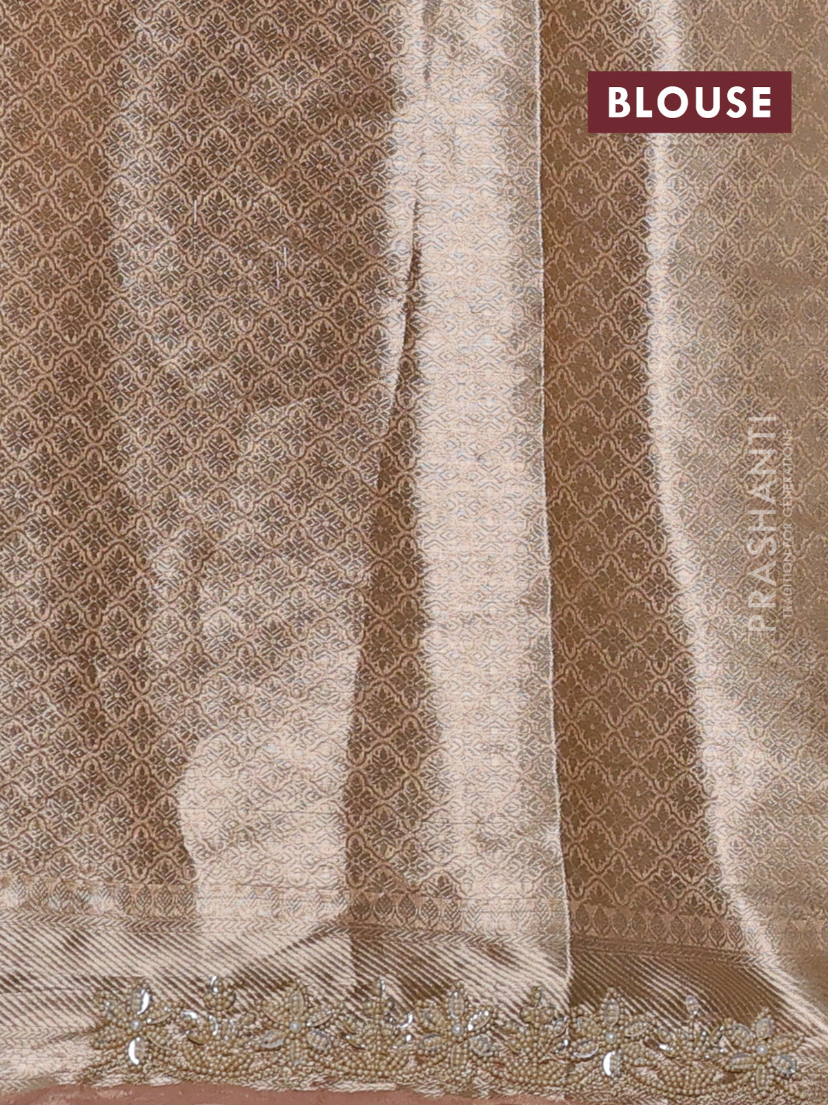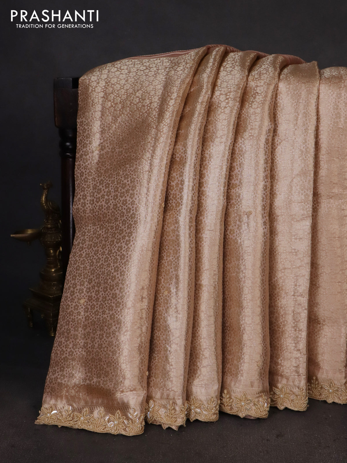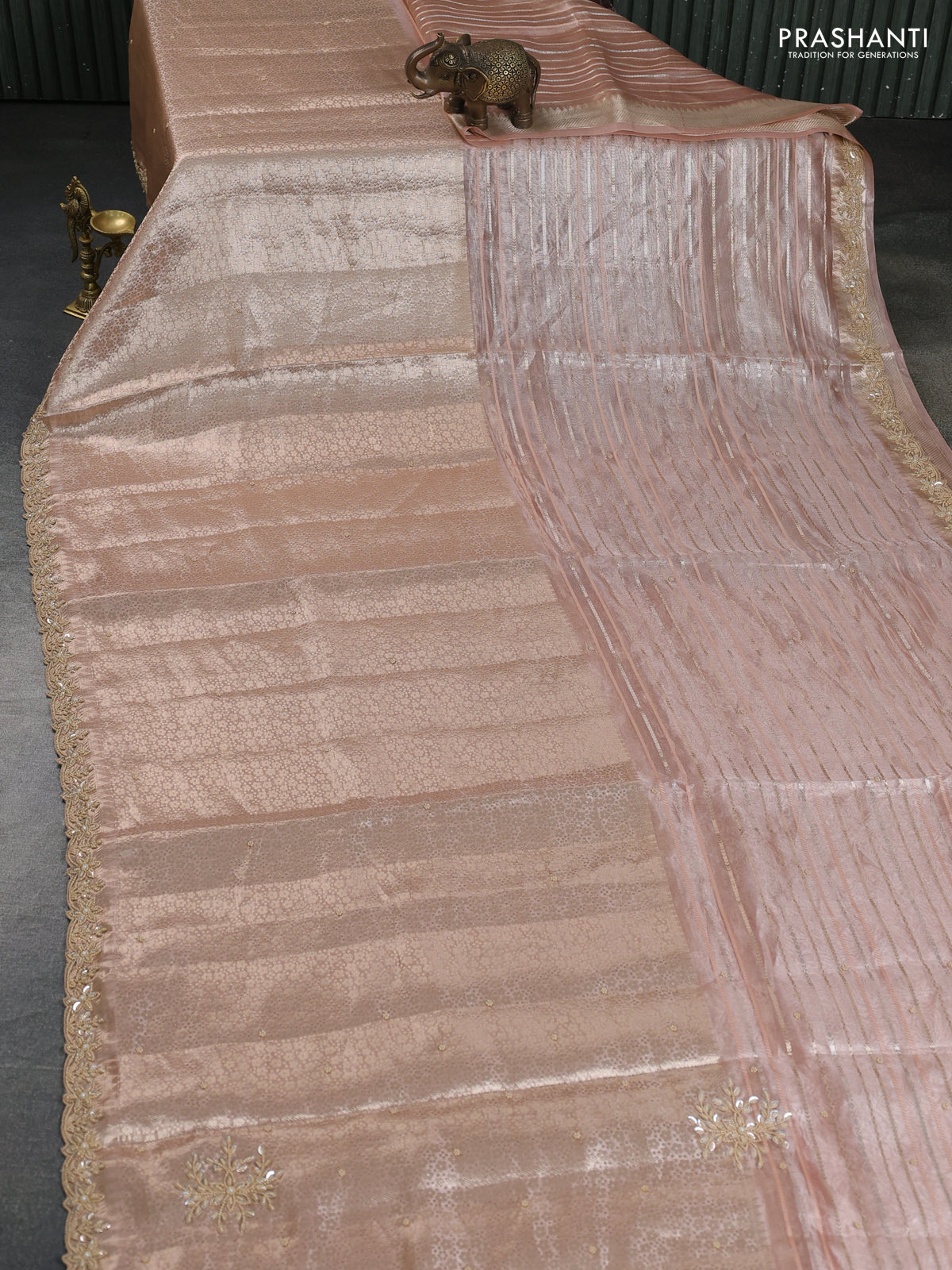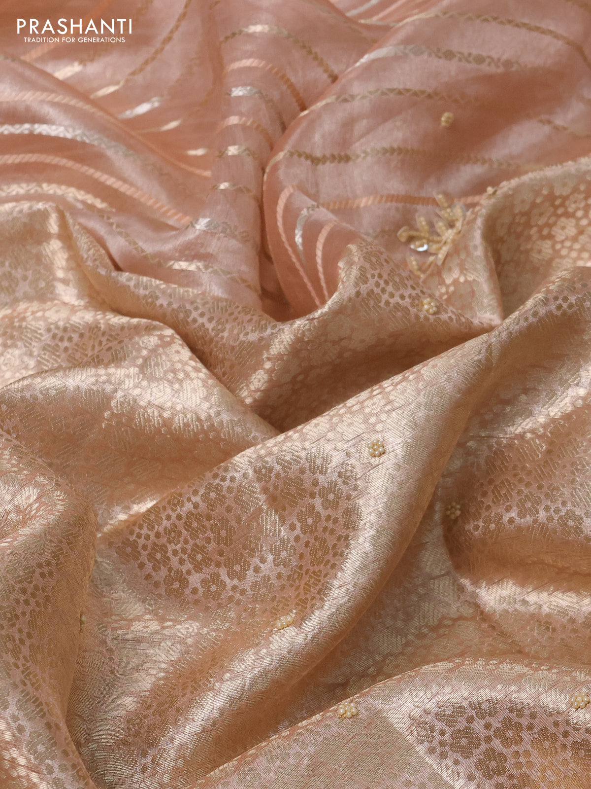 Pure tissue silk saree peach shade with Half & half style zari weaves and beaded work border