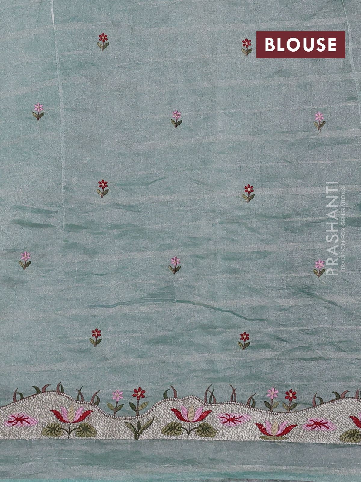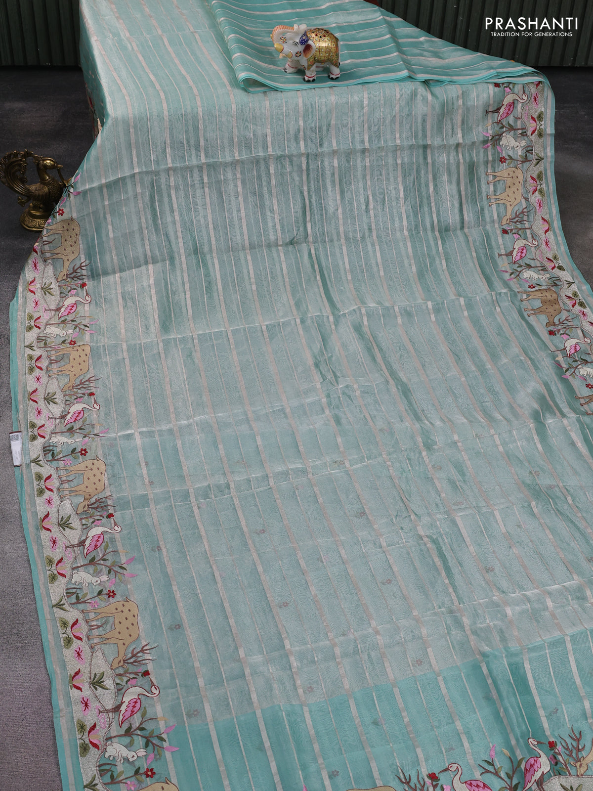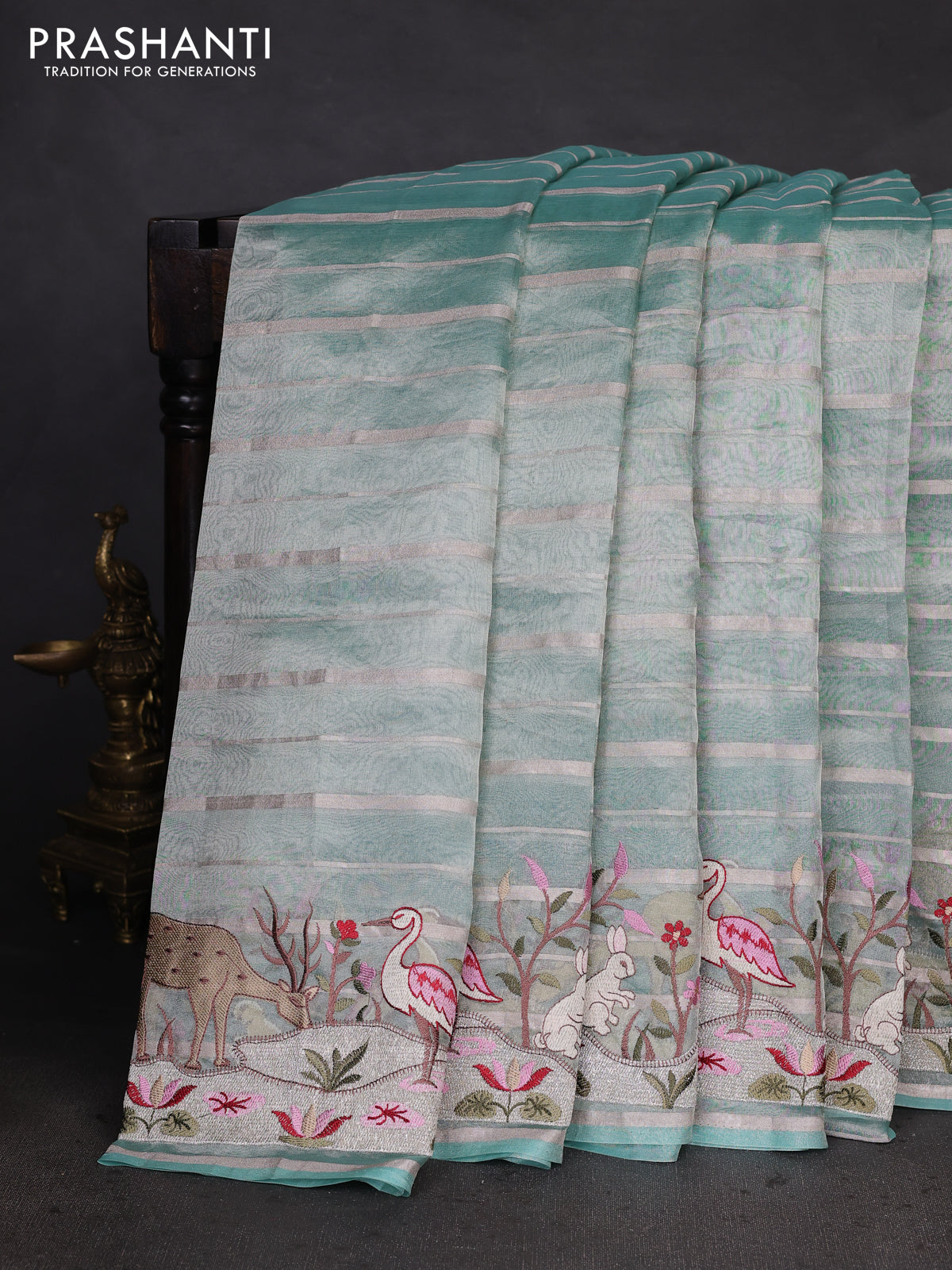 Pure tissue silk saree teal blue with allover silver zari strip pattern & beaded work and embroidery border