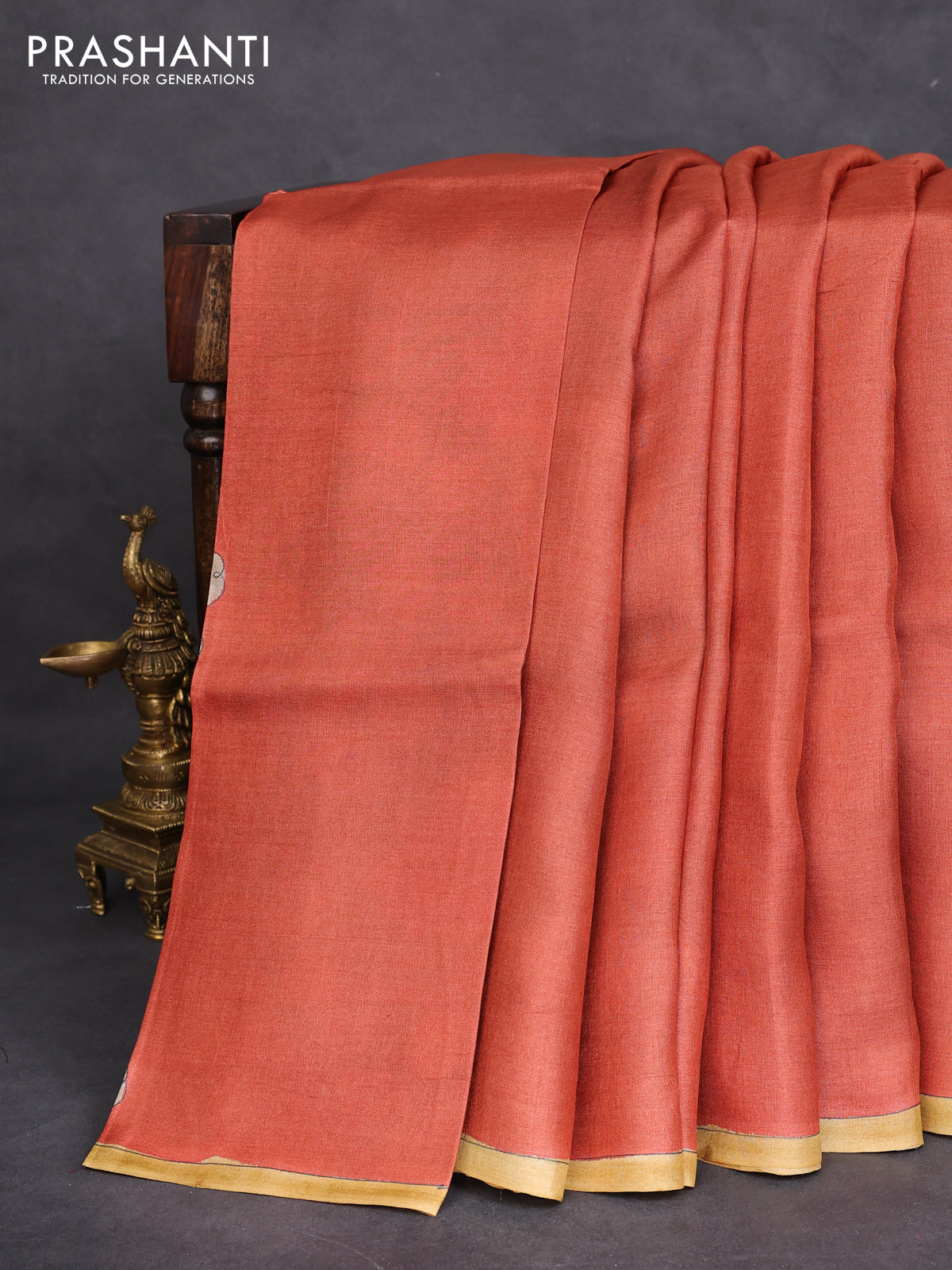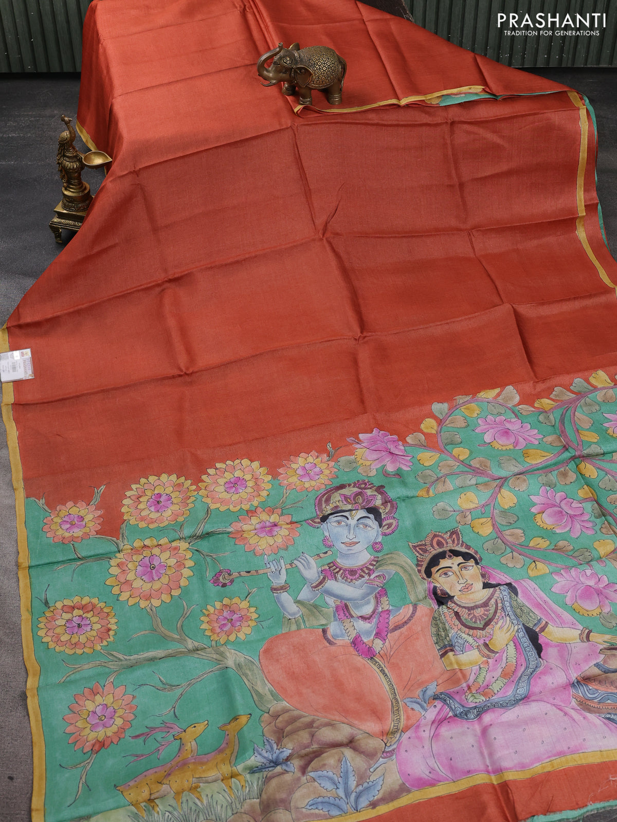 Pure tussar partly silk saree rustic orange and teal green with plain body and kalamkari hand painted prints