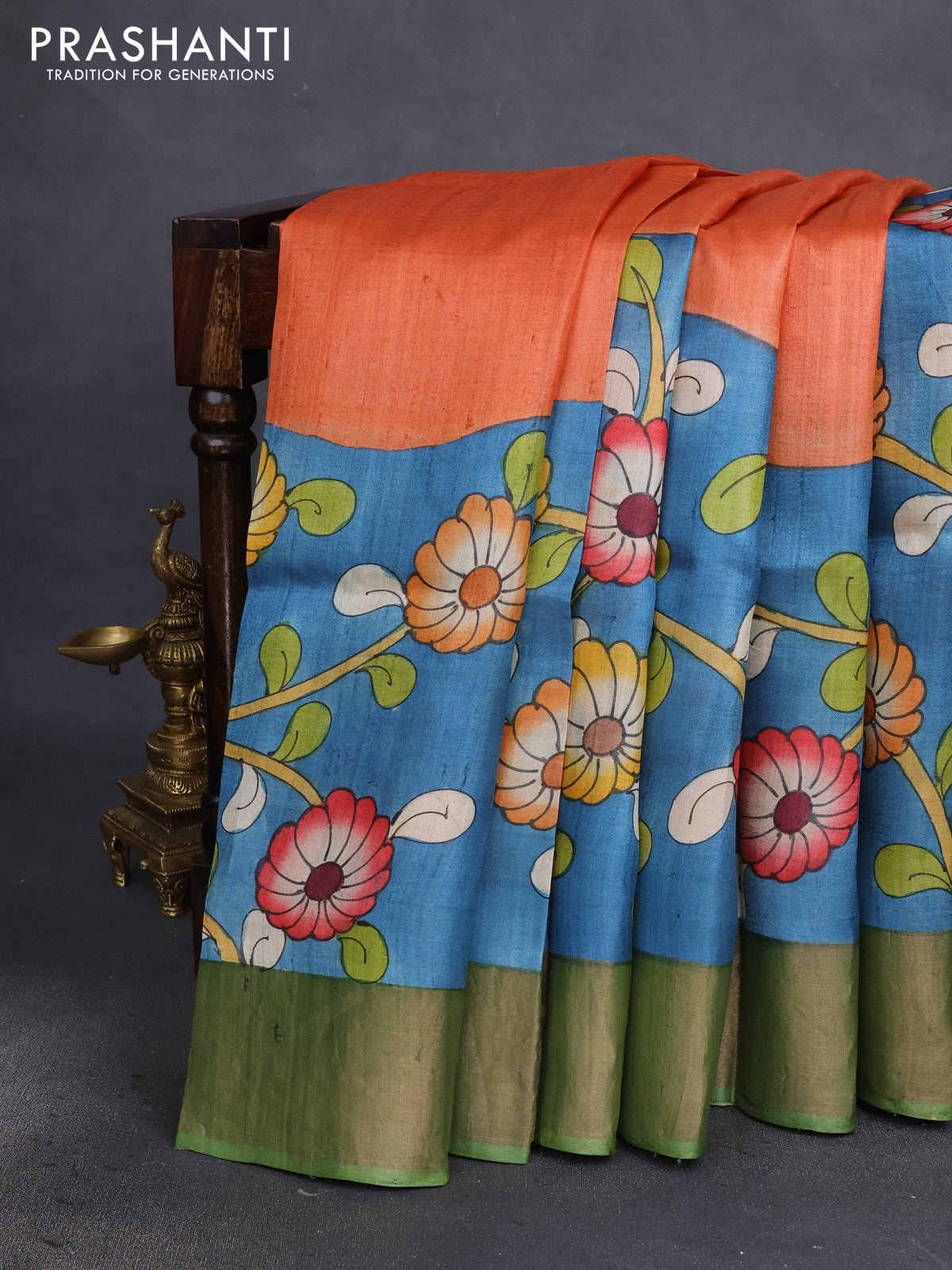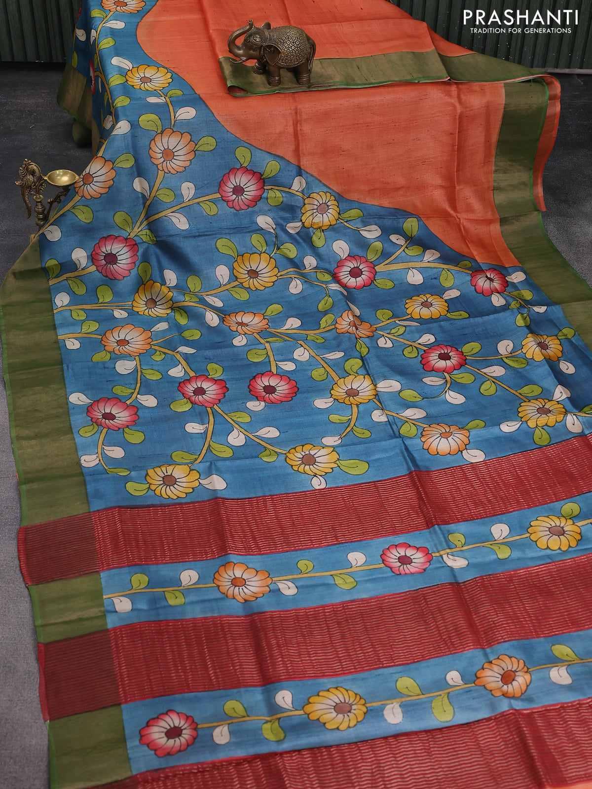 Pure tussar silk saree blue orange and red green with allover floral hand painted prints and zari woven border