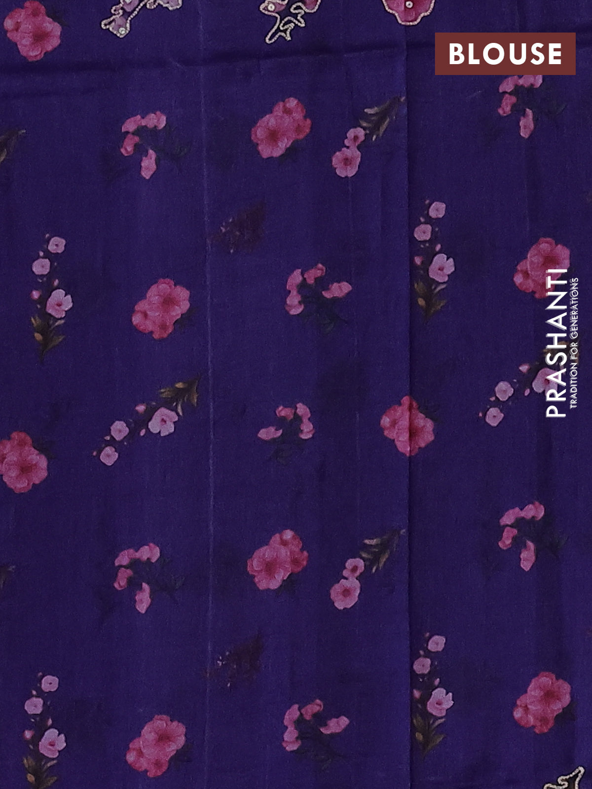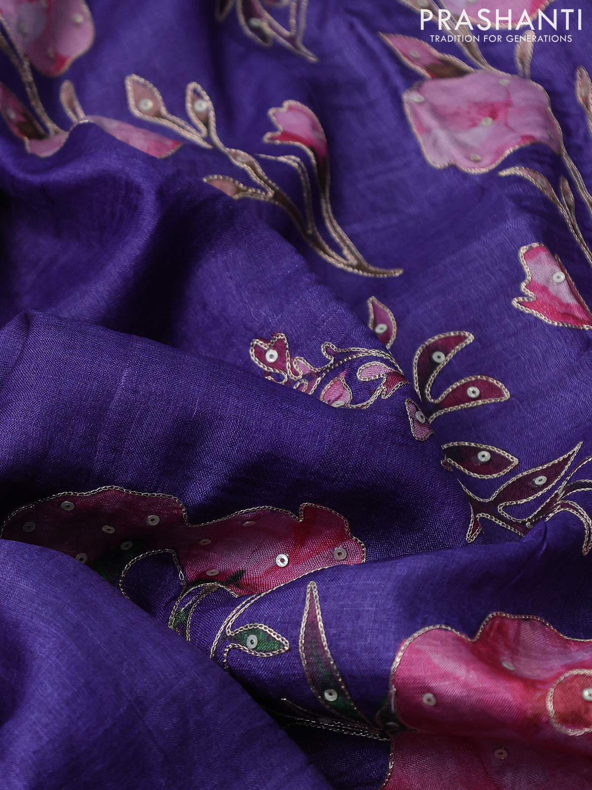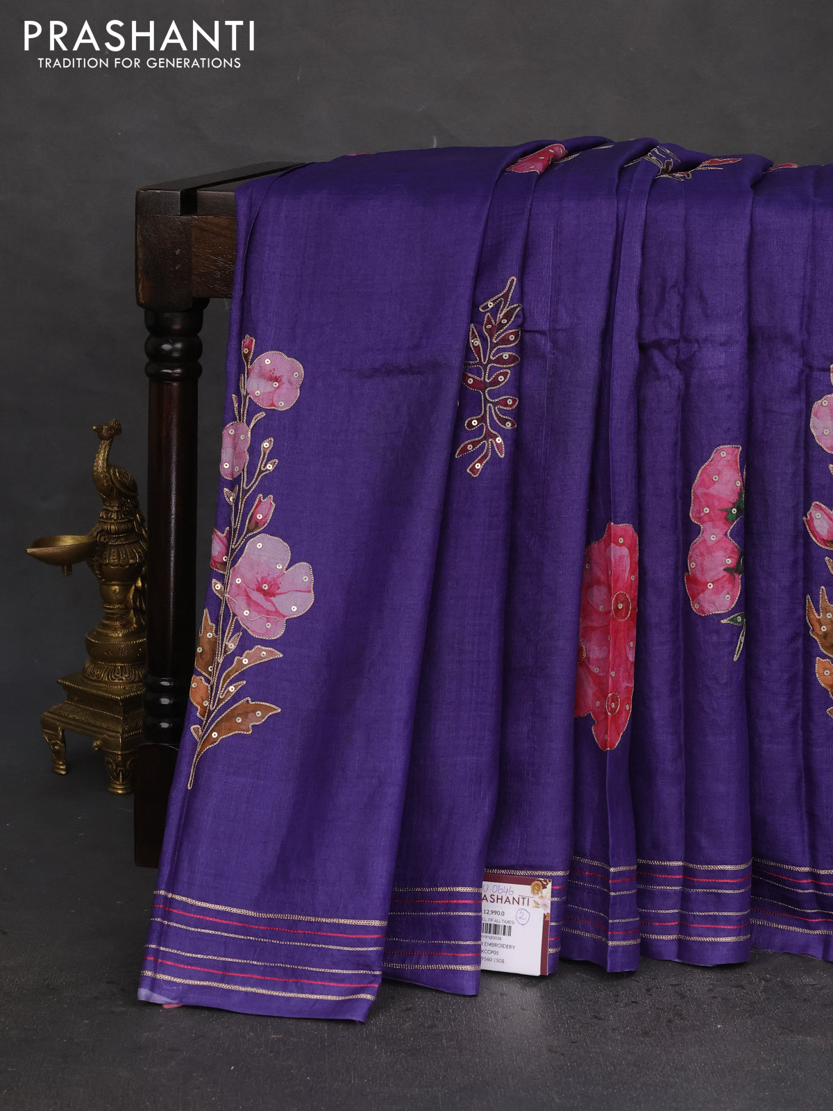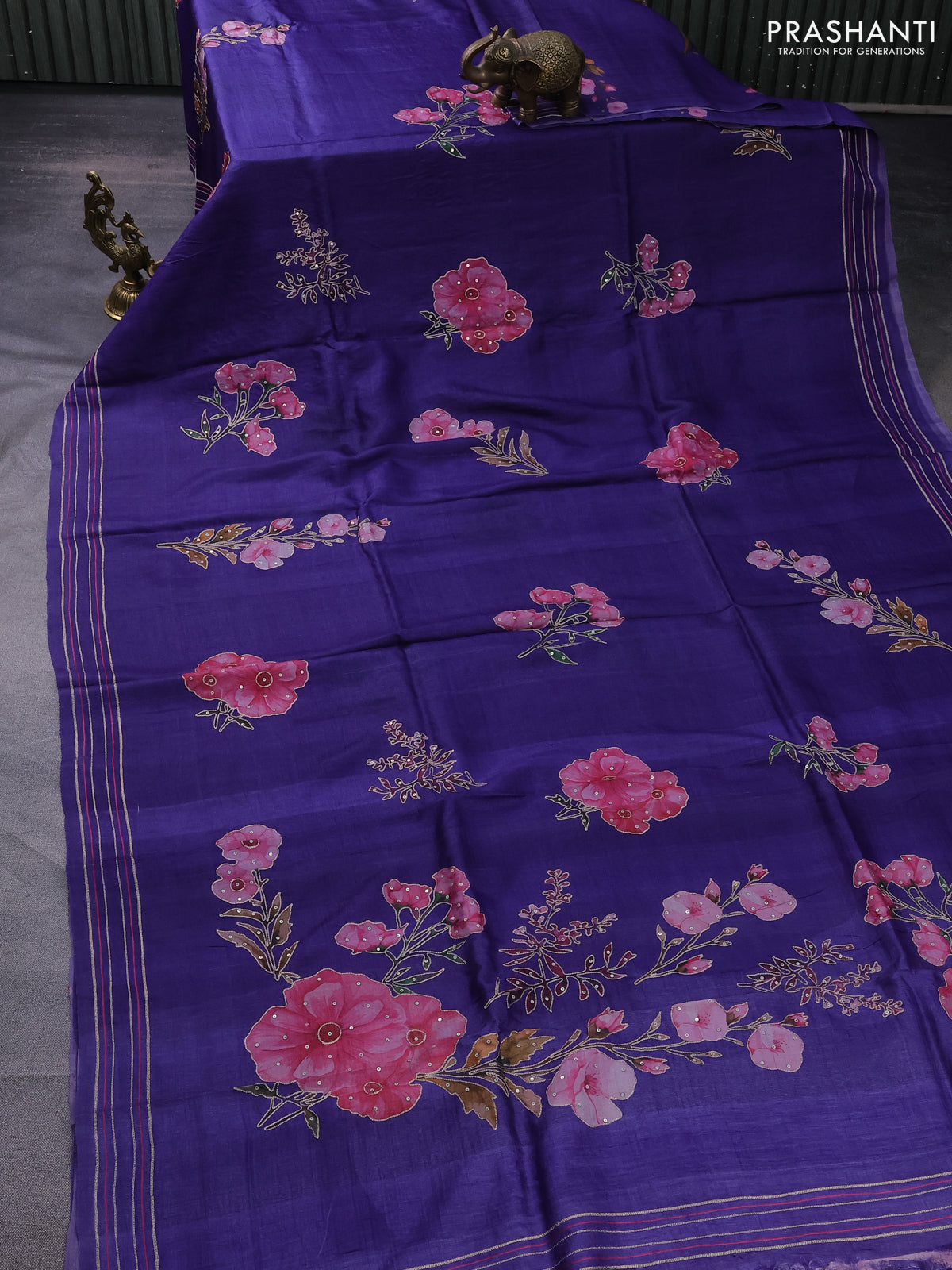 Pure tussar silk saree blue with floral prints & pita work and simple border