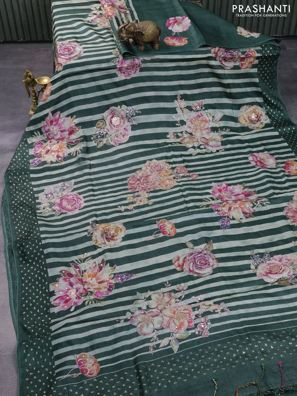 Pure tussar silk saree bottle green with allover stripes pattern floral prints & pita work and sequin work border