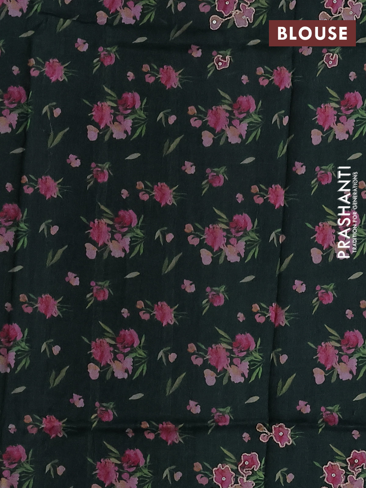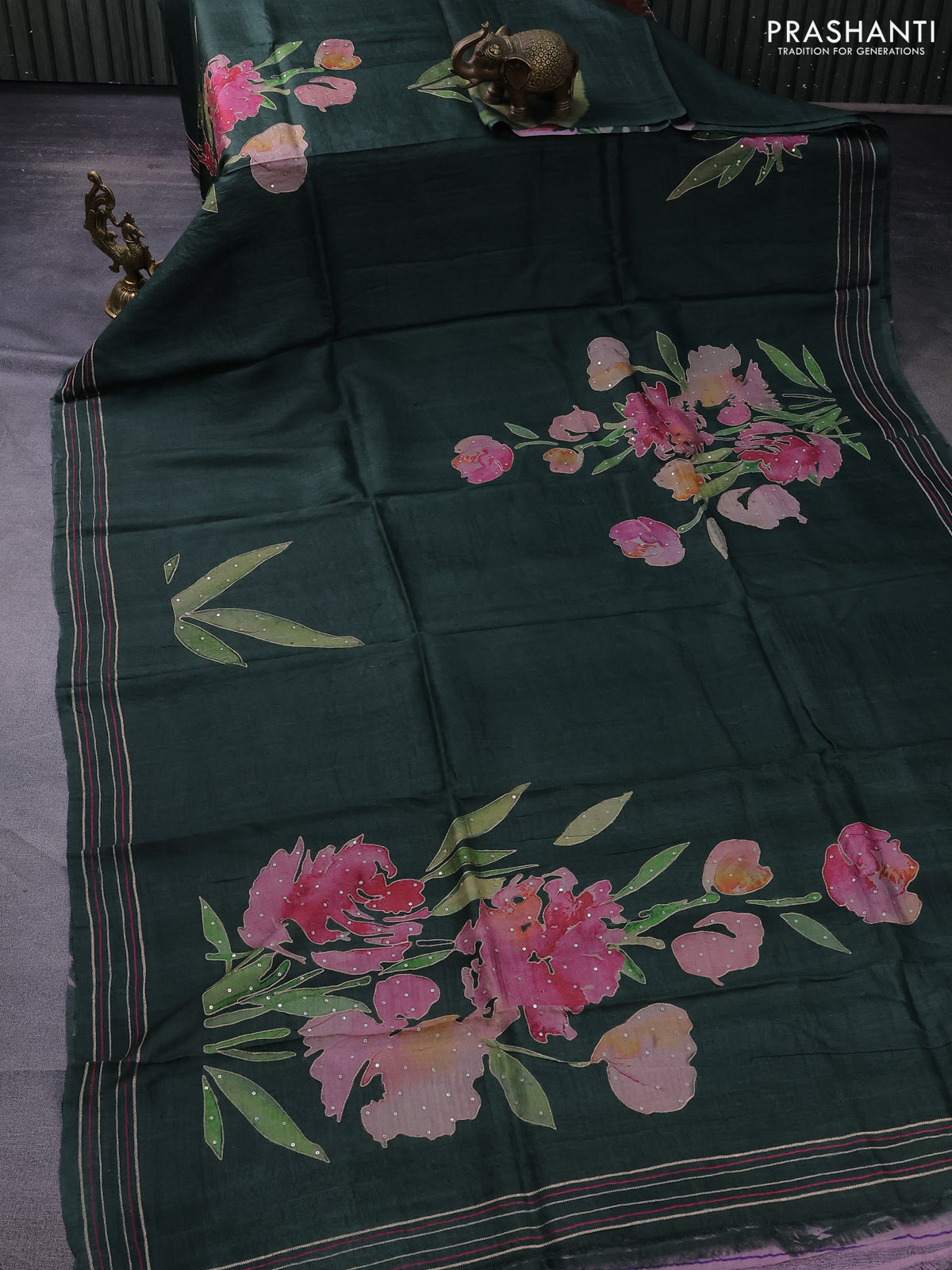Pure tussar silk saree bottle green with floral prints & pita work and simple border